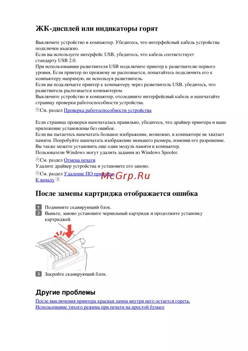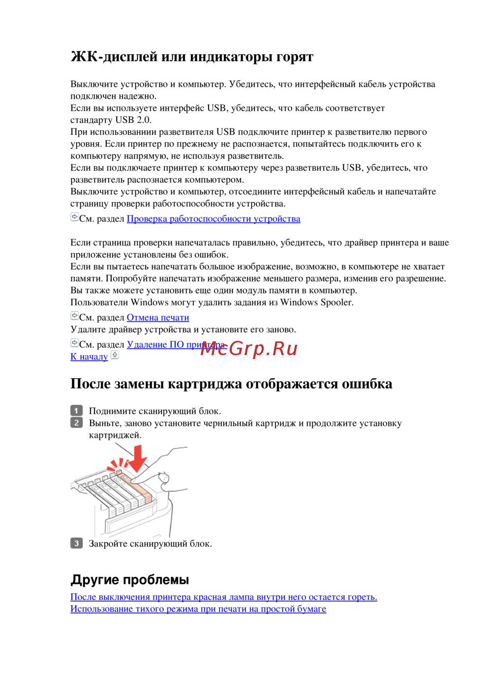 - Роблемы отображаемые сообщениями на жк дисплее принтера или индикаторами p.143