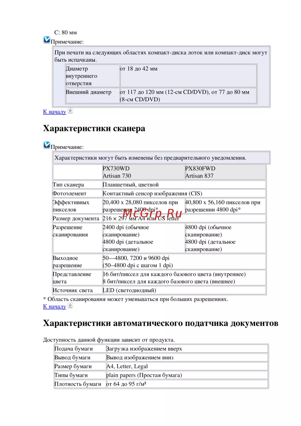 Epson PX730WD — характеристики сканеров и компакт-дисков: размеры и разрешение [168/176]