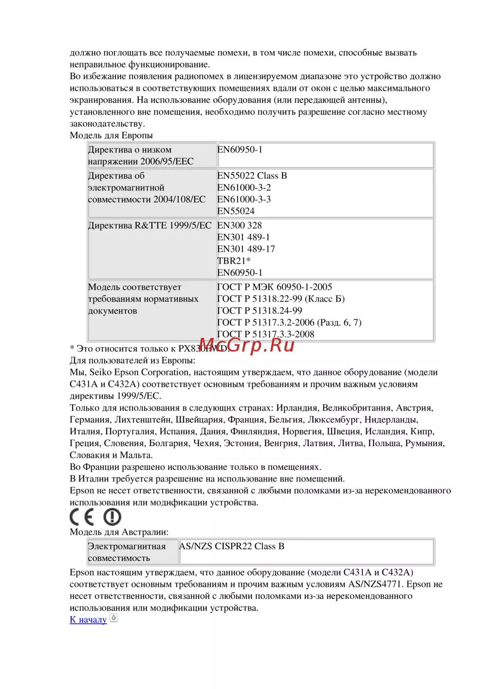 соответствует основным требованиям и прочим важным условиям AS/NZS4771. Epson не