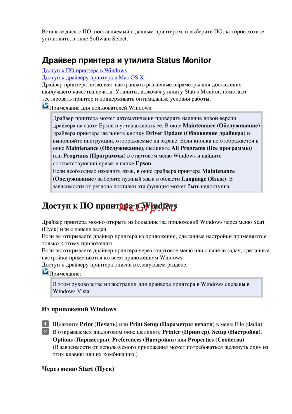 Драйвер принтера можно открыть из большинства приложений Windows через меню Start