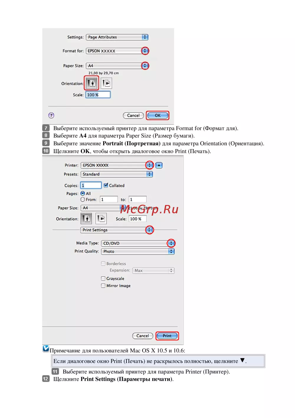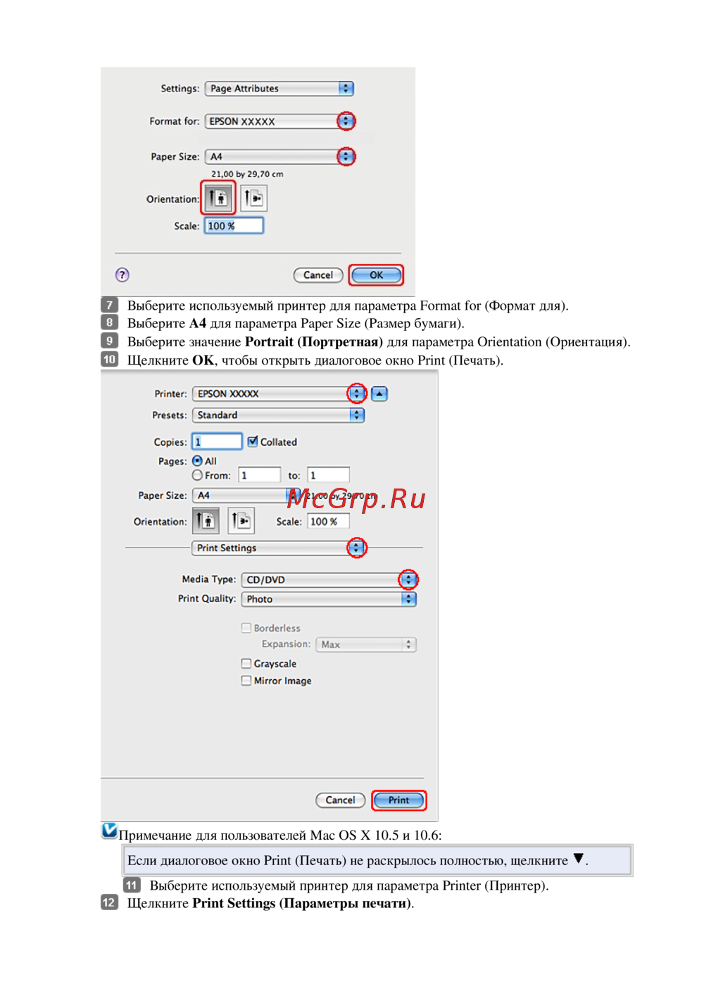 Примечание для пользователей Mac OS X 10.5 и 10.6: