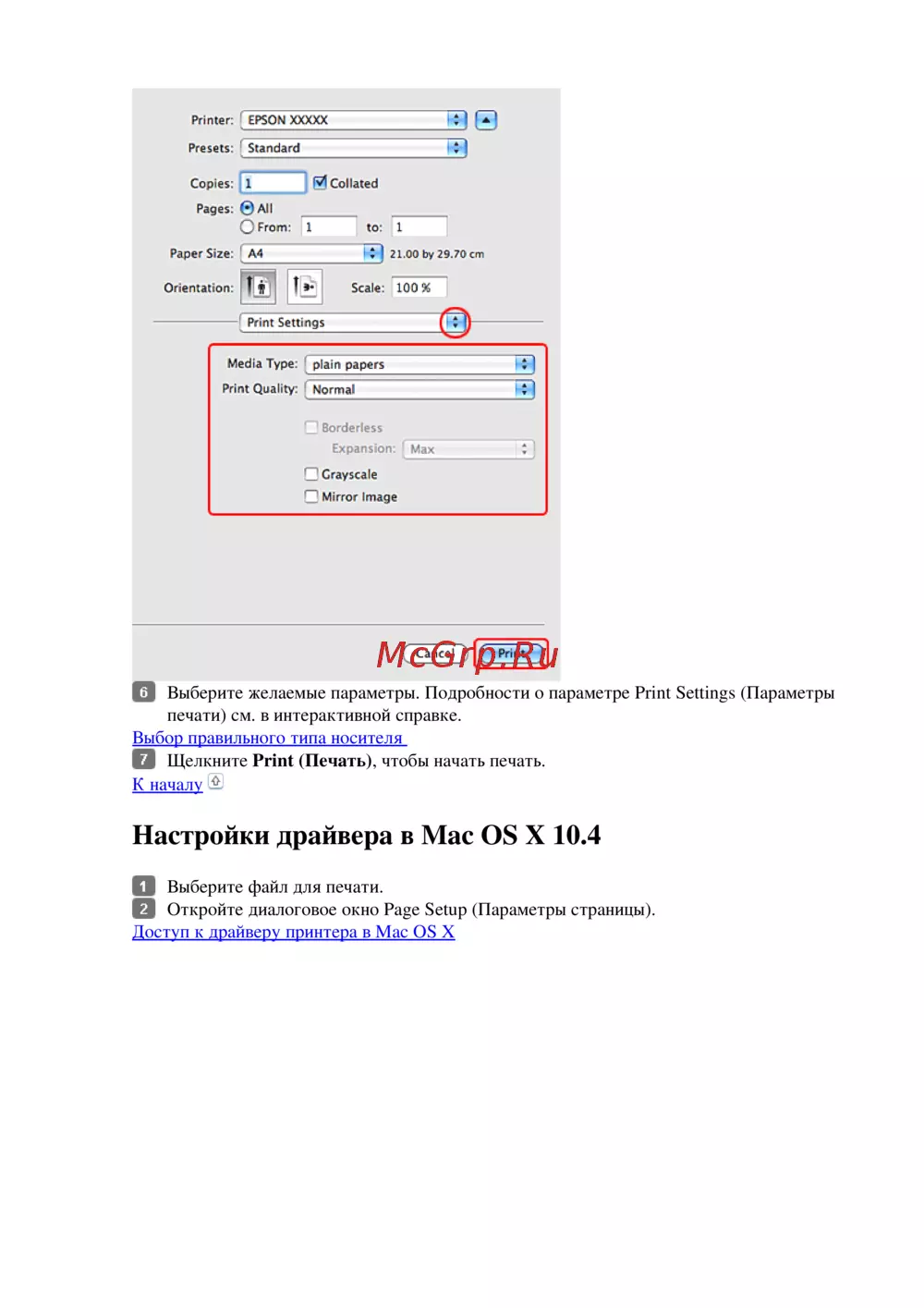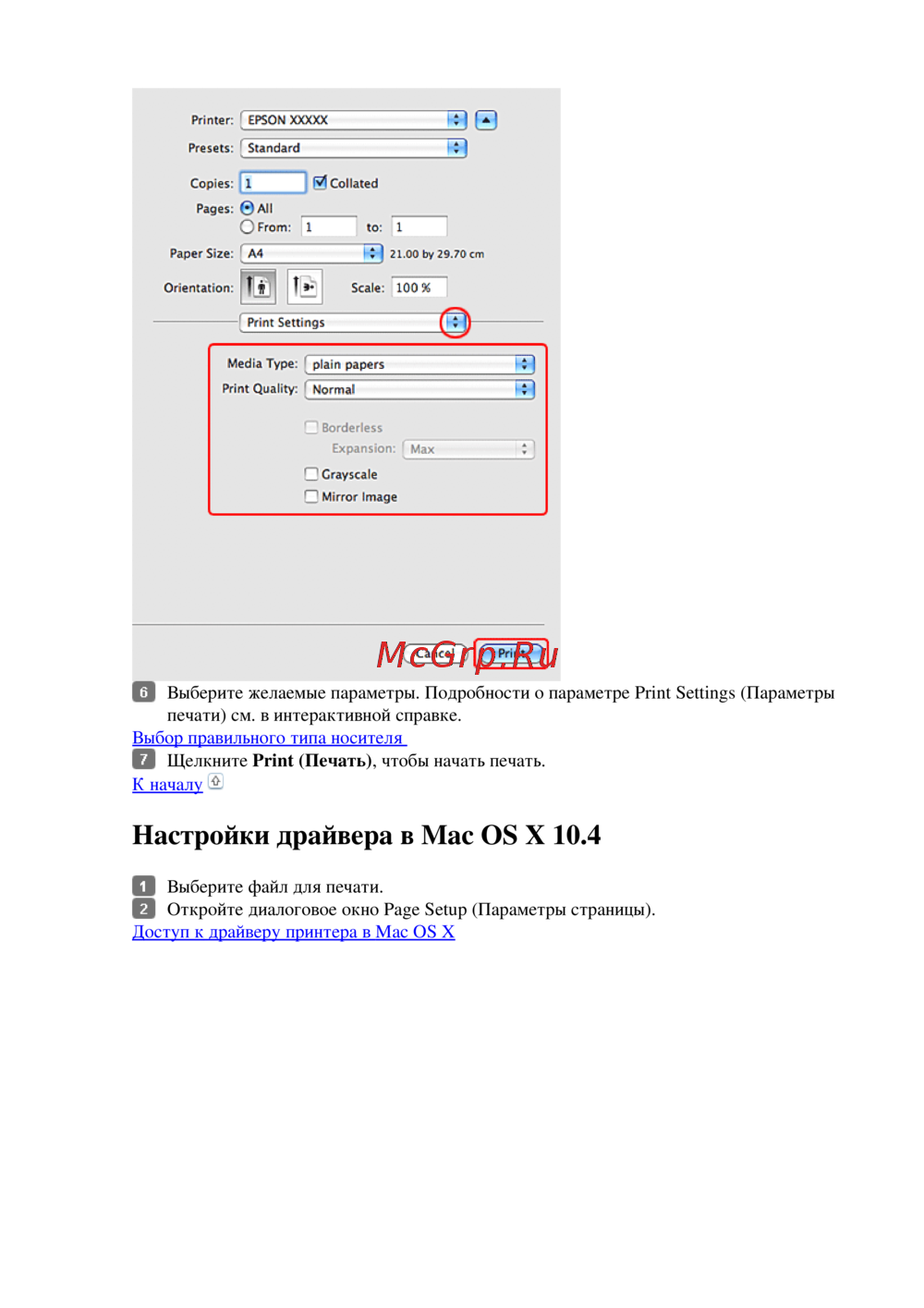 Настройки драйвера в Mac OS X 10.4