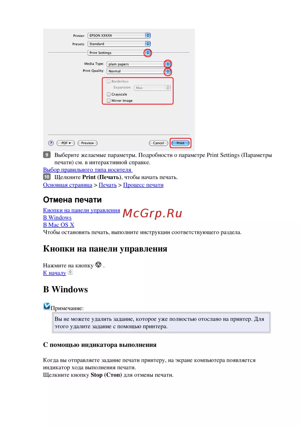 Узнайте, как выбрать параметры печати, начать и отменить печать на вашем устройстве. Подробные инструкции для Windows и Mac OS X.