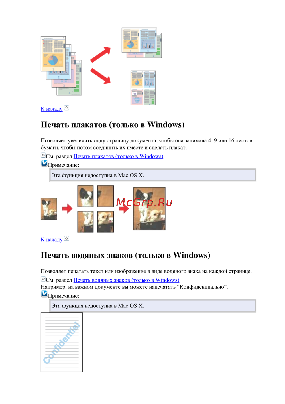 Инструкция по печати больших плакатов из одного листа и добавлению водяных знаков на документы. Подробное описание настроек и ограничений.