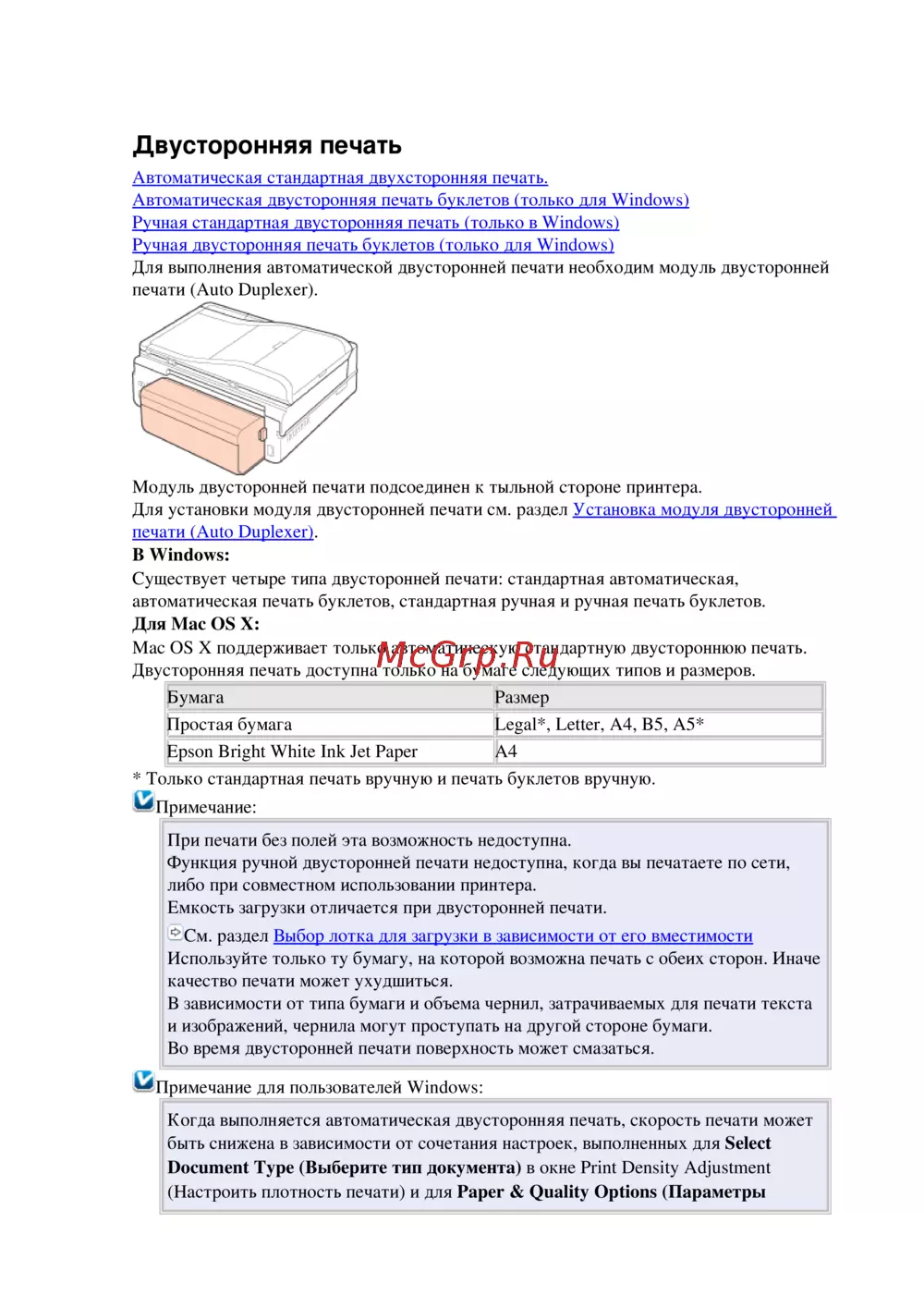 Узнайте о различных способах двусторонней печати, включая автоматические и ручные методы. Подробности о совместимости бумаги и настройках печати.