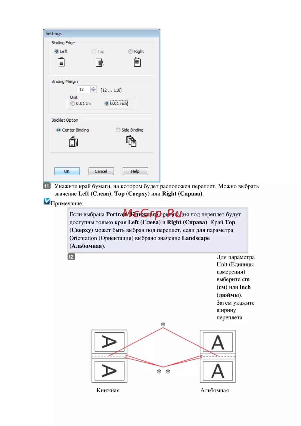 Если выбрана Portrait (Книжная) ориентация под переплет будут