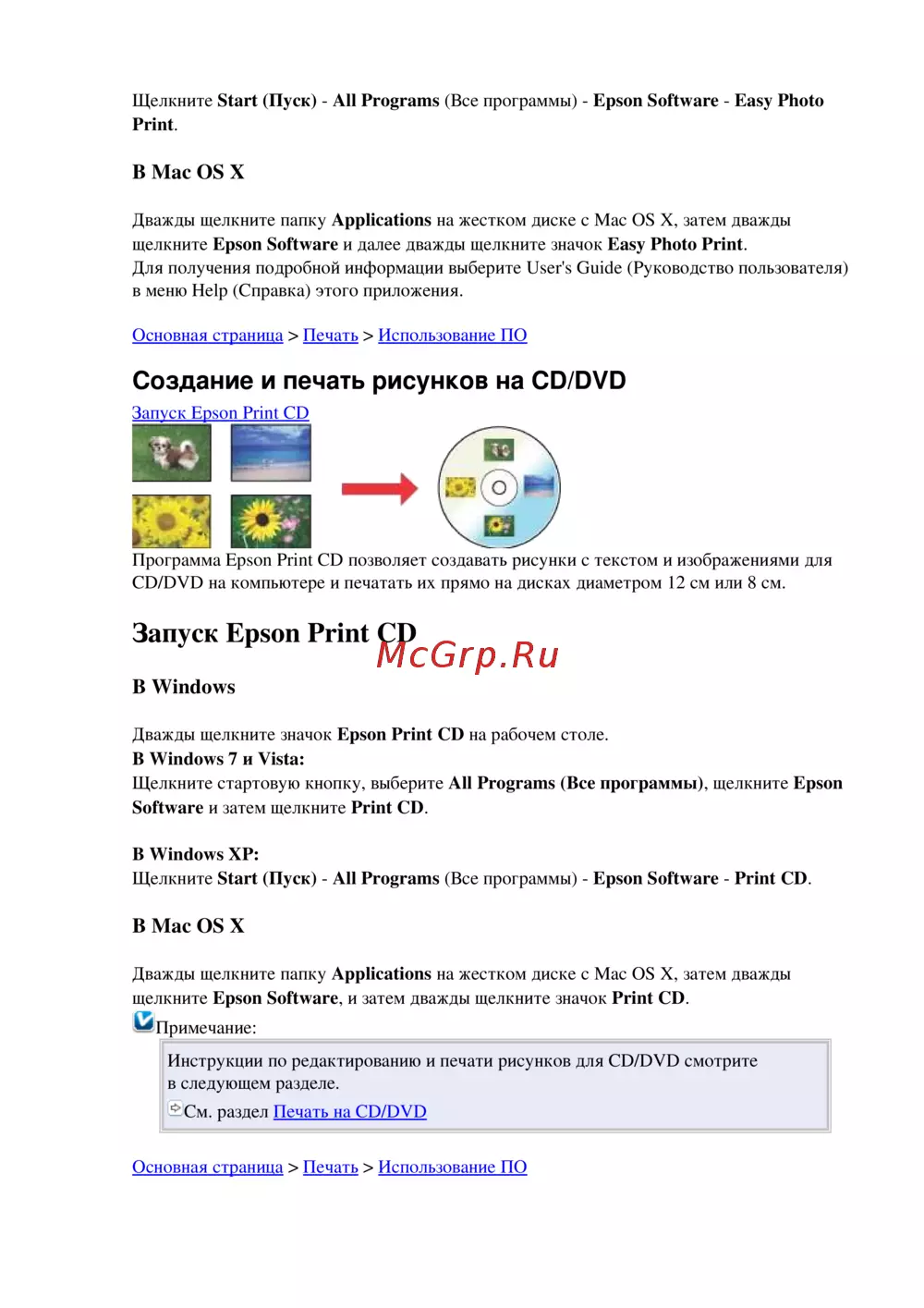 Щелкните Start (Пуск) - All Programs (Все программы) - Epson Software - Print CD.