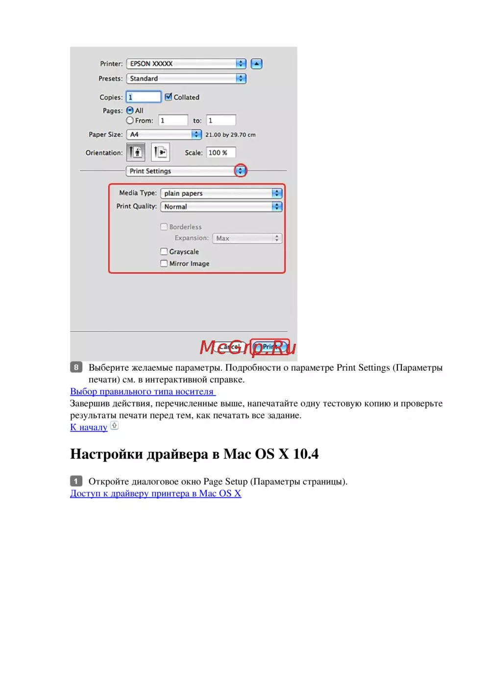 Настройки драйвера в Mac OS X 10.4
