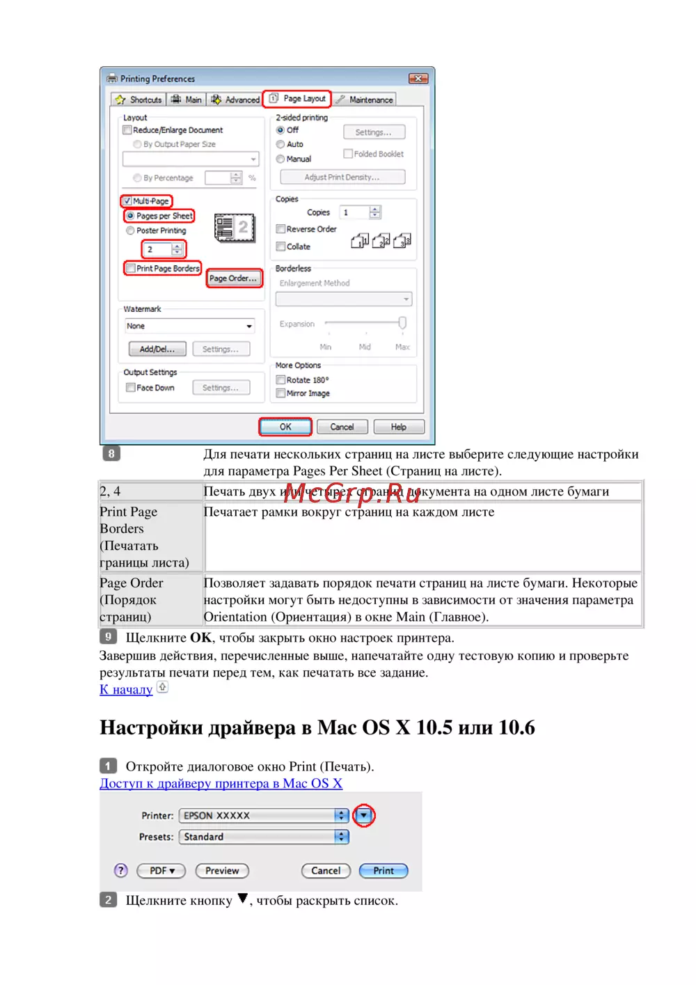 2, 4 Печать двух или четырех страниц документа на одном листе бумаги