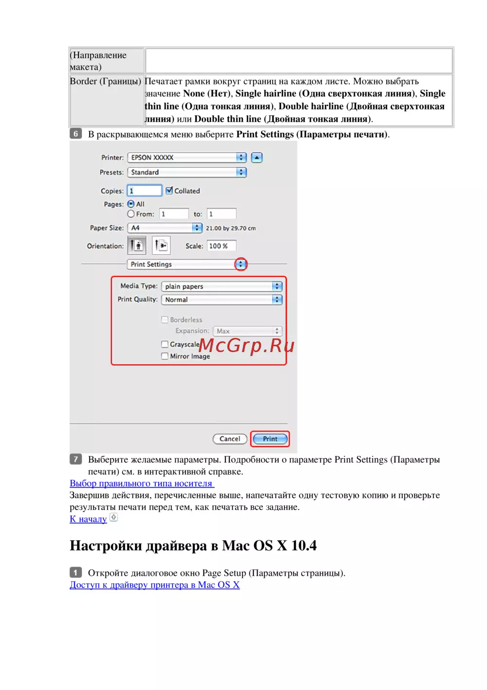 Настройки драйвера в Mac OS X 10.4