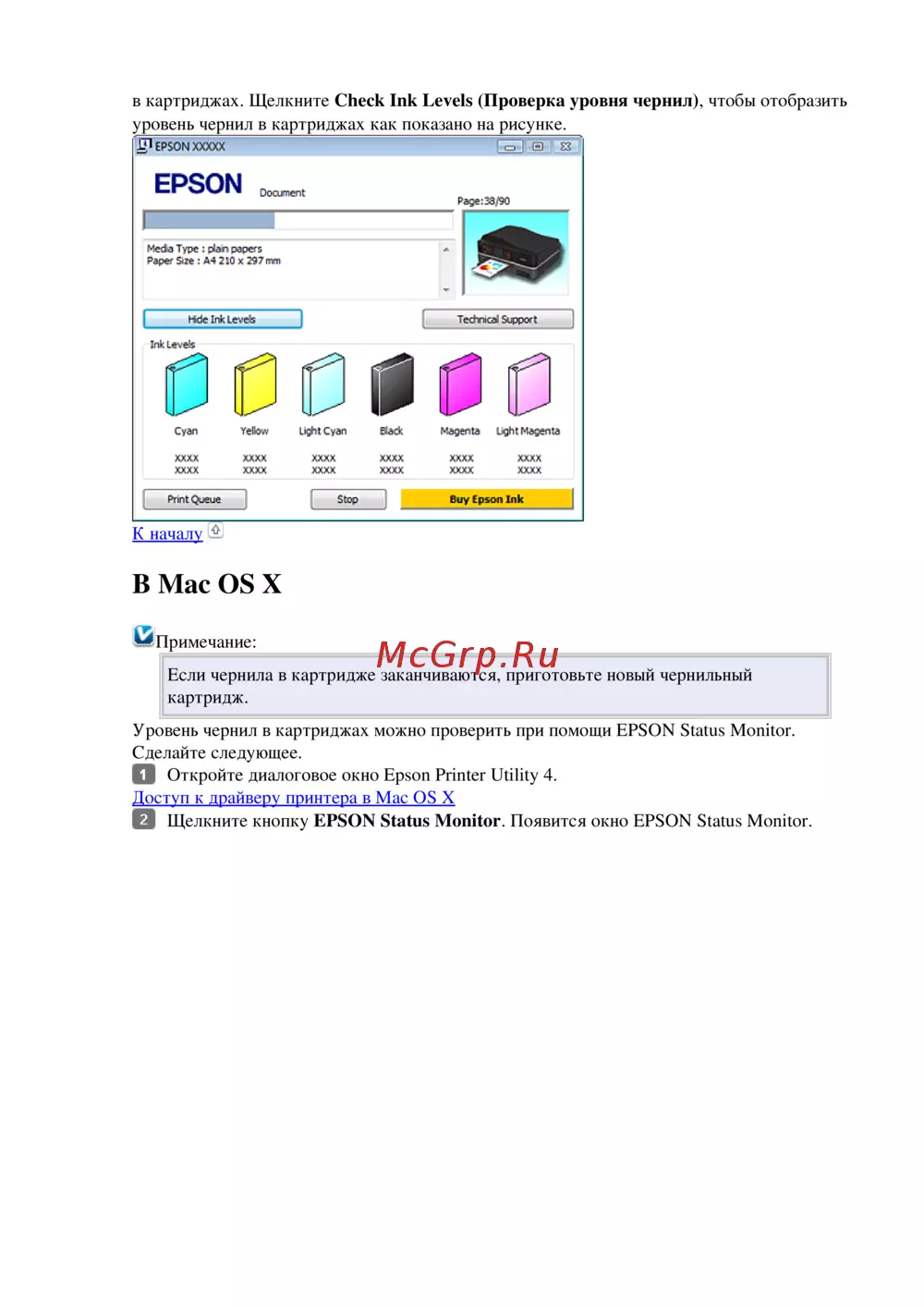 Уровень чернил в картриджах можно проверить при помощи EPSON Status Monitor.