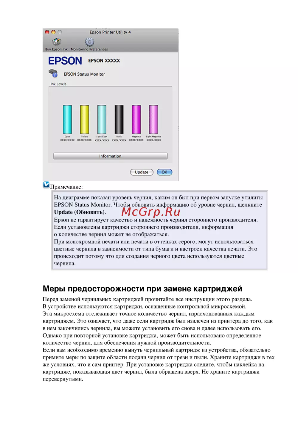 EPSON Status Monitor. Чтобы обновить информацию об уровне чернил, щелкните