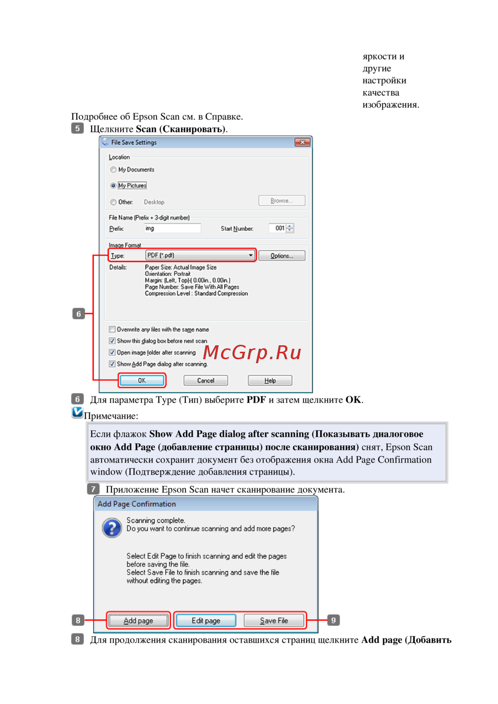 Если флажок Show Add Page dialog after scanning (Показывать диалоговое