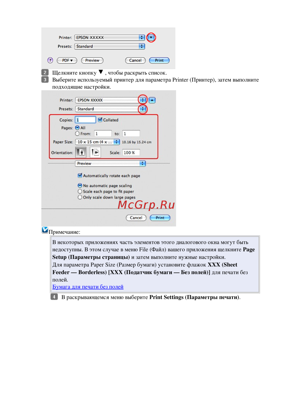 Epson Stylus SX435W — как настроить параметры печати и размер бумаги без полей [16/146]