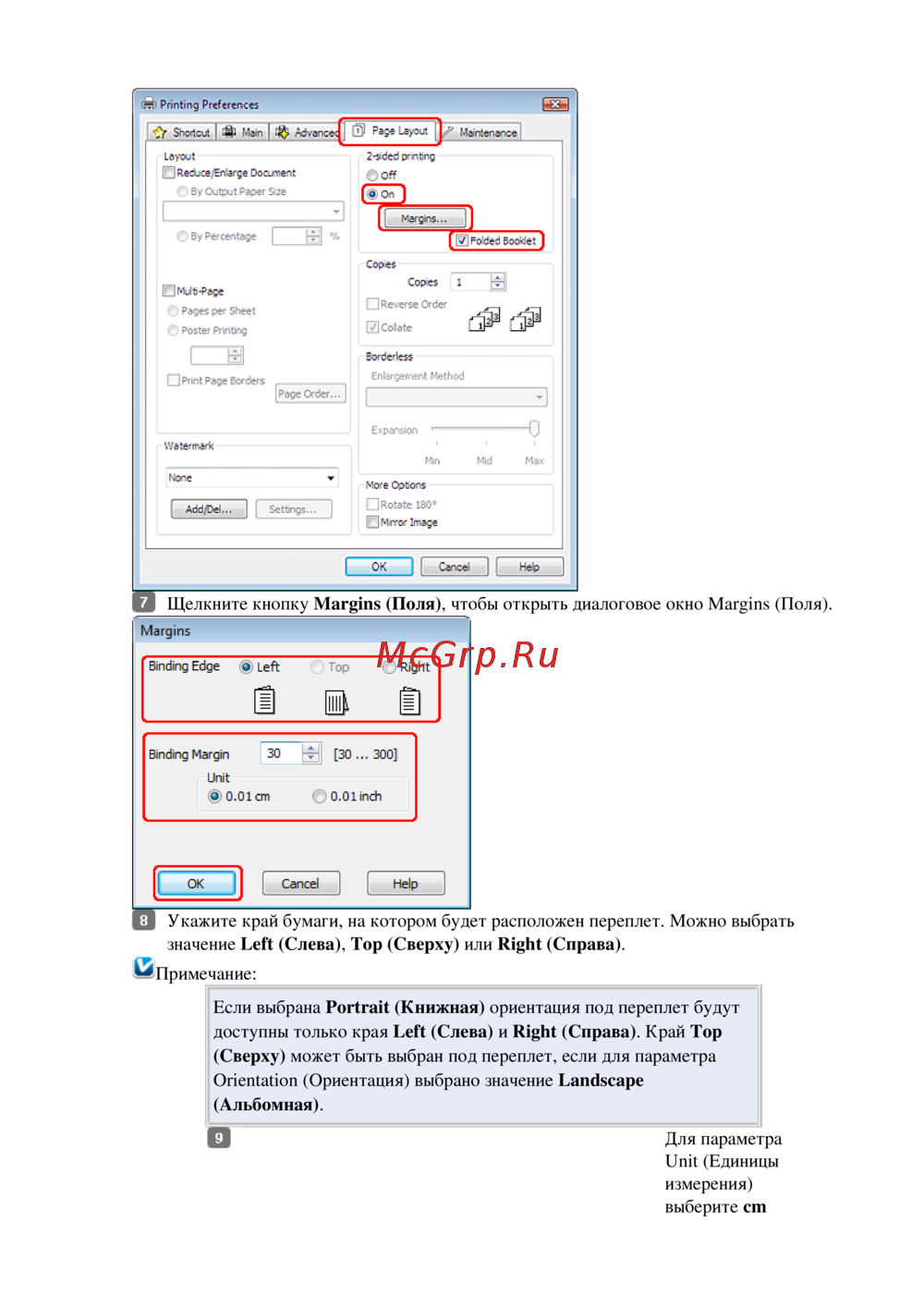 Если выбрана Portrait (Книжная) ориентация под переплет будут