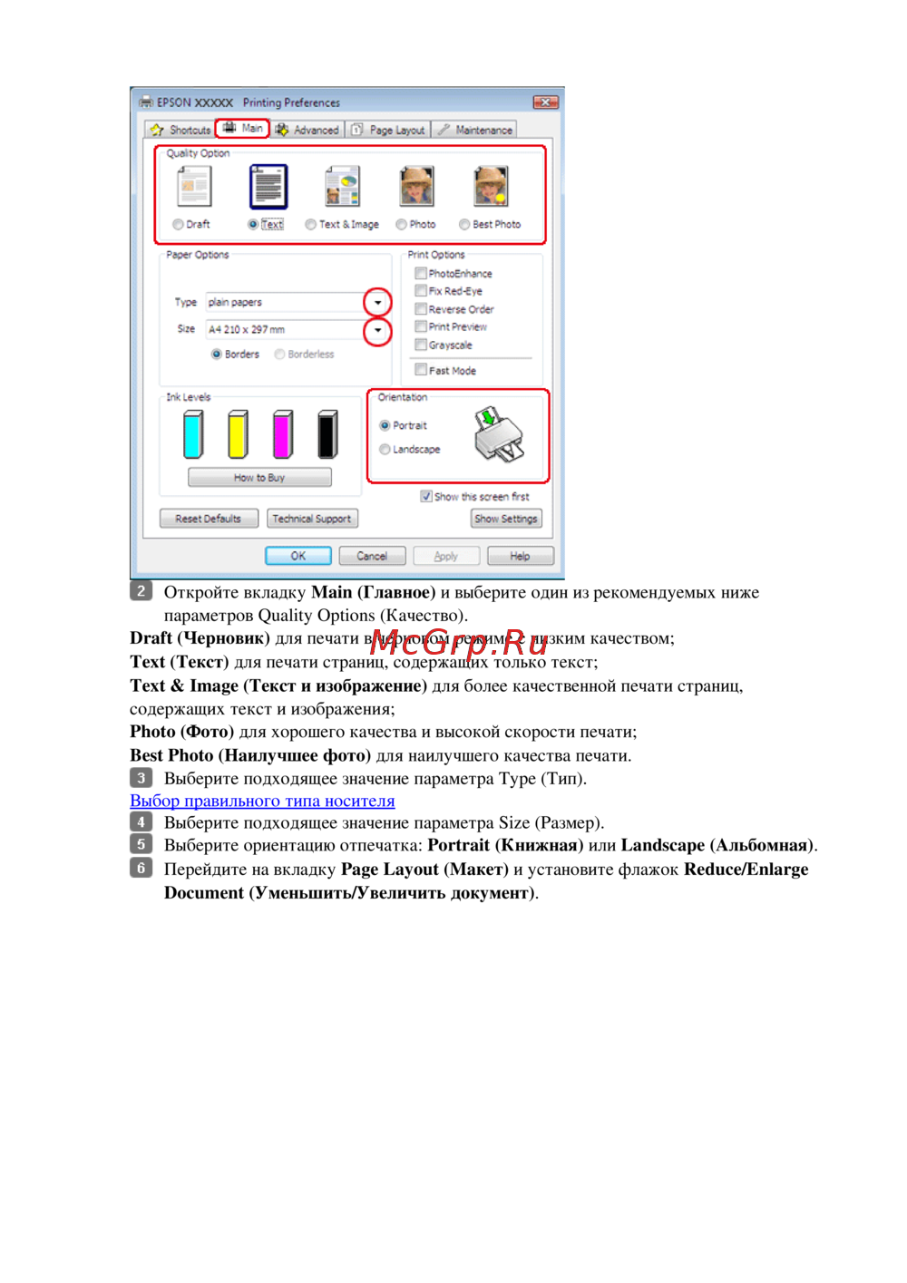 Узнайте, как выбрать параметры печати для достижения наилучшего качества. Откройте вкладку Main и настройте качество, тип и размер документа.