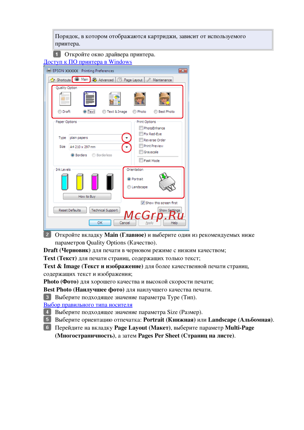 Выберите ориентацию отпечатка: Portrait (Книжная) или Landscape (Альбомная).