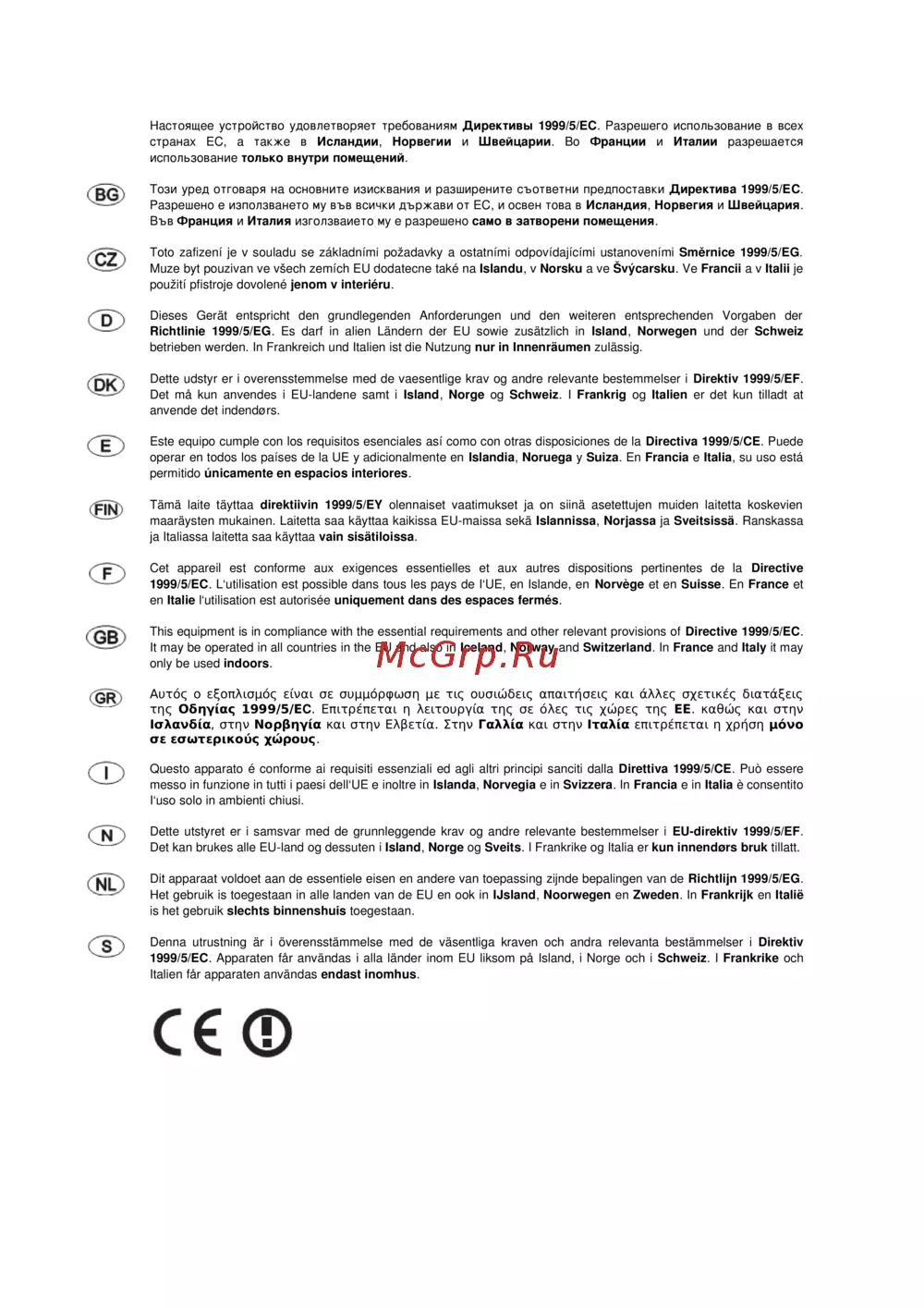 Данное устройство соответствует требованиям Директивы 1999/5/EC и разрешено к использованию в странах ЕС, Исландии, Норвегии и Швейцарии. В некоторых странах разрешено только в помещениях.
