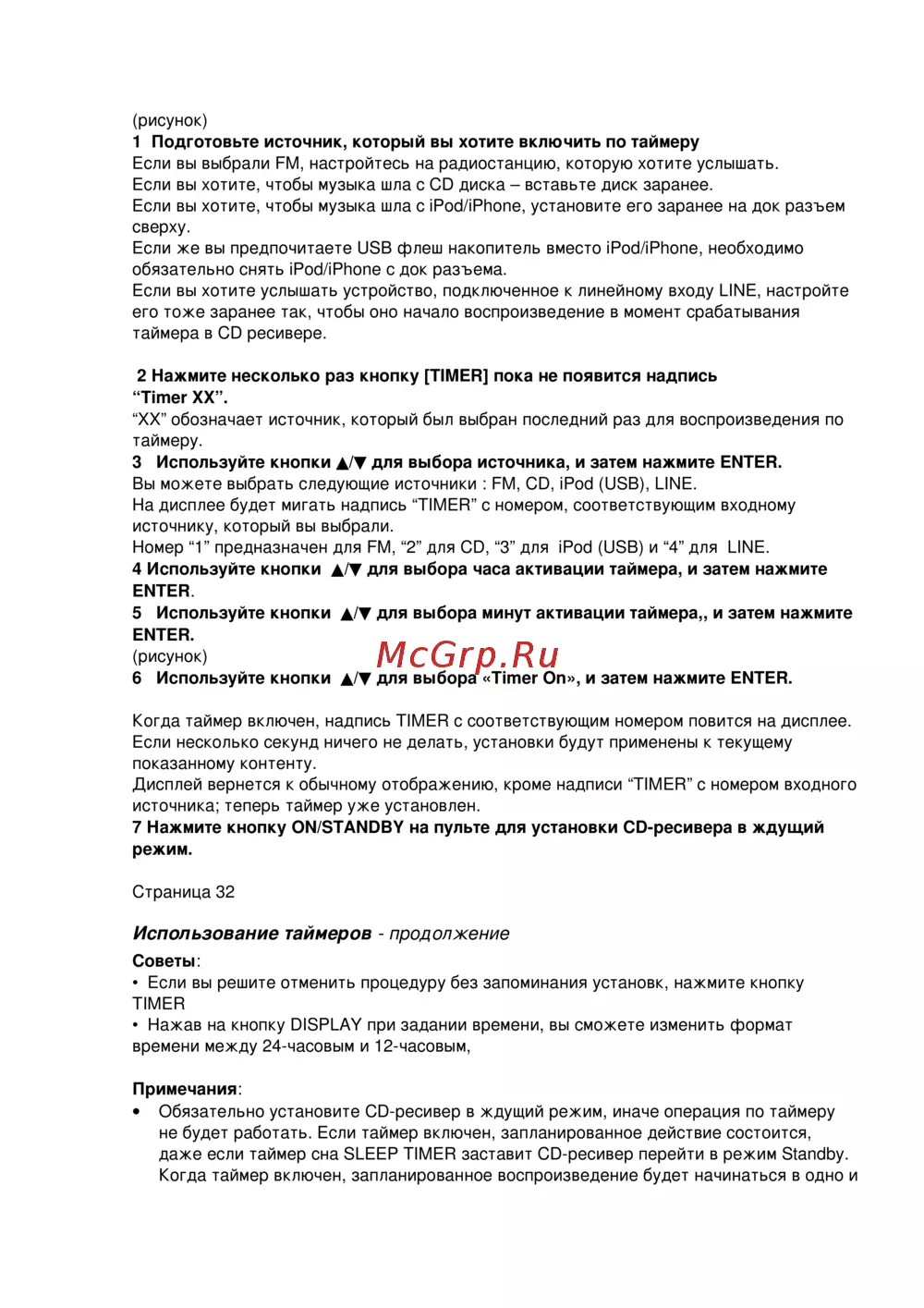 Обязательно установите CD-ресивер в ждущий режим, иначе операция по таймеру