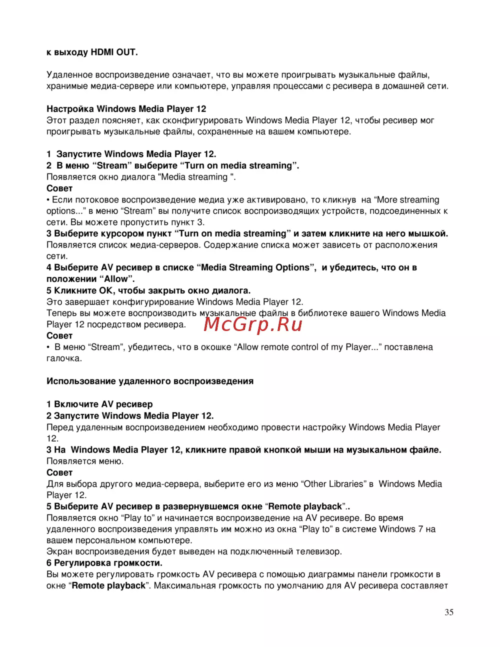Перед удаленным воспроизведением необходимо провести настройку Windows Media Player