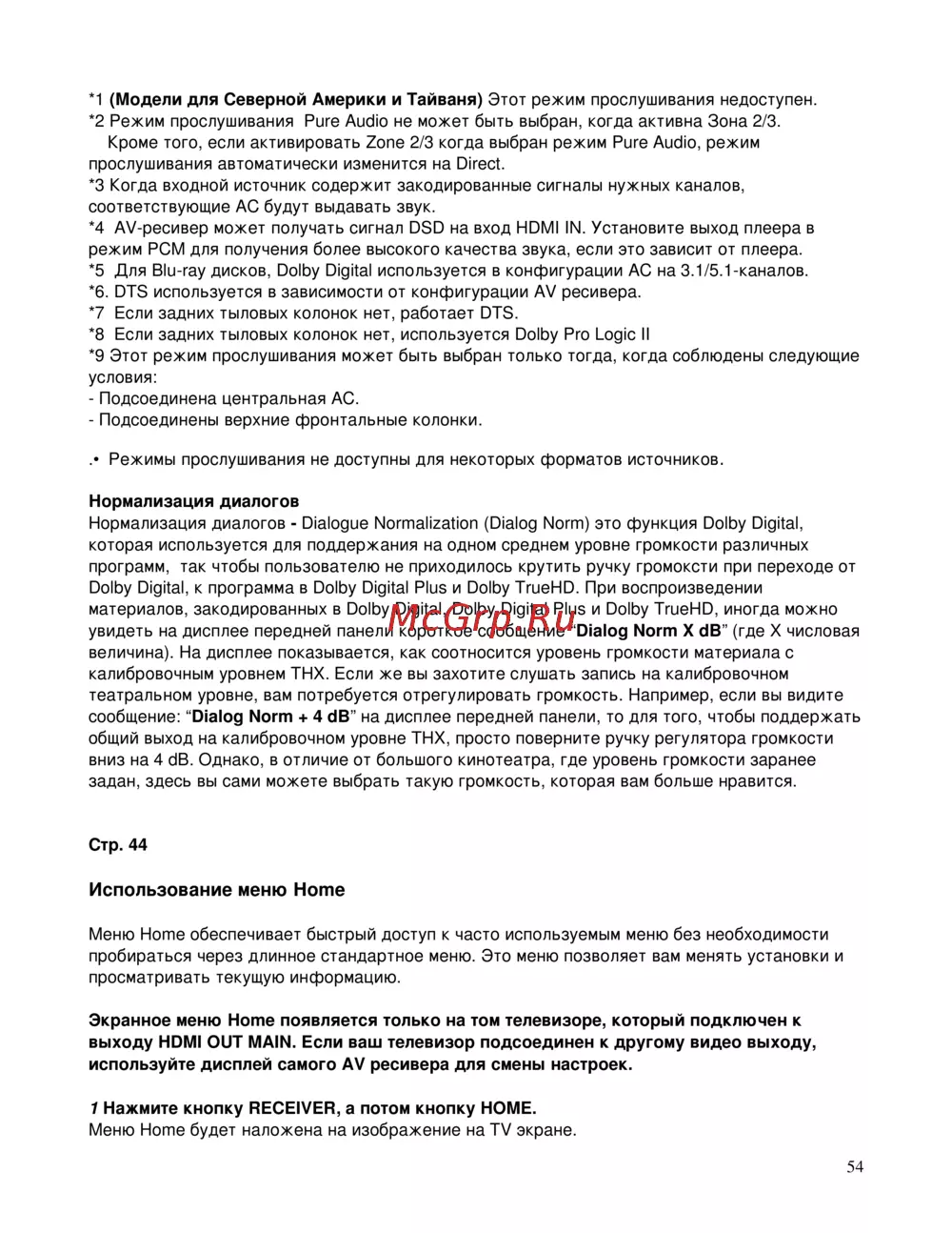 Узнайте о режимах прослушивания AV-ресивера, нормализации диалогов Dolby Digital и управлении через меню Home. Подключение HDMI, настройка звука для 3D/5.1 каналов.