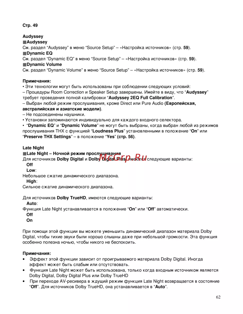 См. раздел “Audyssey” в меню “Source Setup” – «Настройка источников» (стр. 59).