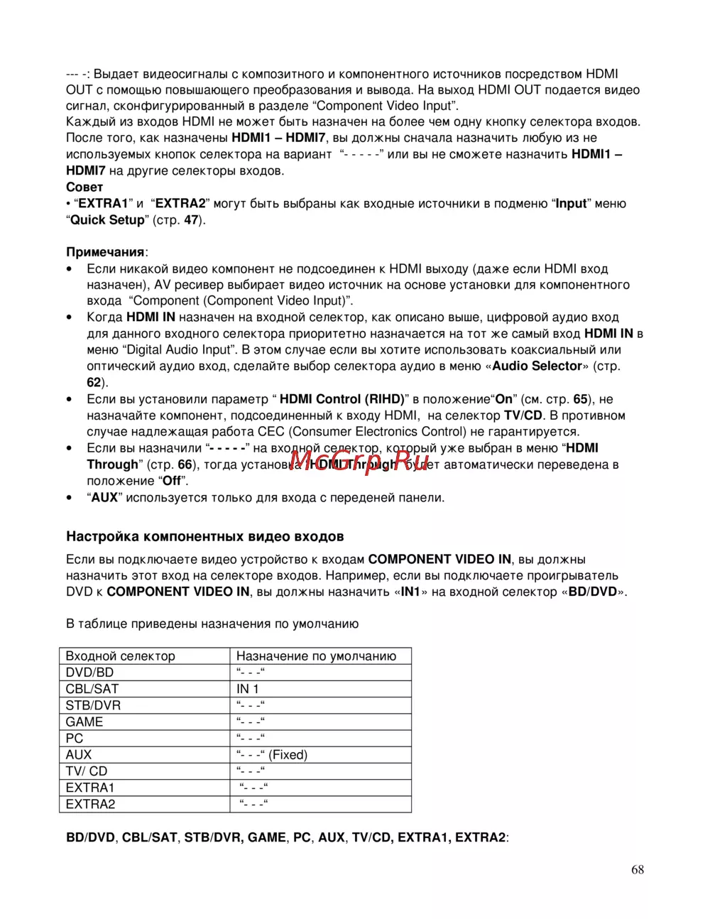назначен), AV ресивер выбирает видео источник на основе установки для компонентного