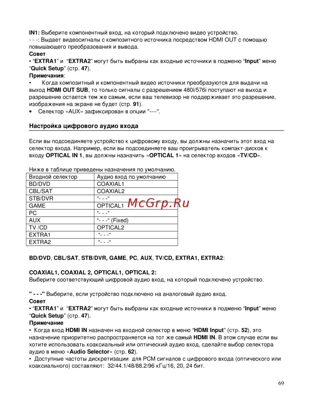 хотите использовать коаксиальный или оптический аудио вход, сделайте выбор селектора