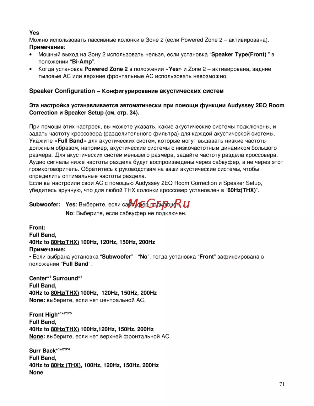 убедитесь вручную, что для любой THX колонки кроссовер установлен в “80Hz(THX)”.