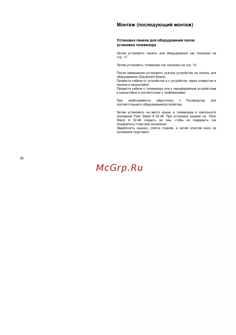 - Установка панели для оборудования после установки телевизора p.20