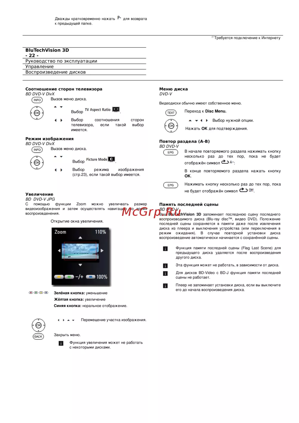 Изучите функции управления воспроизведением дисков, включая выбор соотношения сторон, режимы изображения и функции увеличения. Узнайте, как использовать память последней сцены.