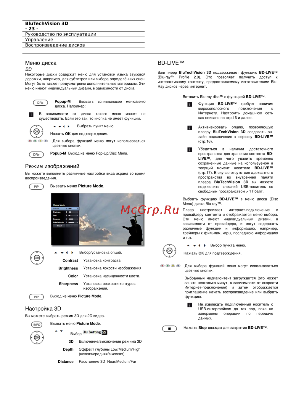 Узнайте, как управлять 3D плеером, настраивать звук и изображение, а также использовать функции BD-LIVE для доступа к интерактивному контенту.