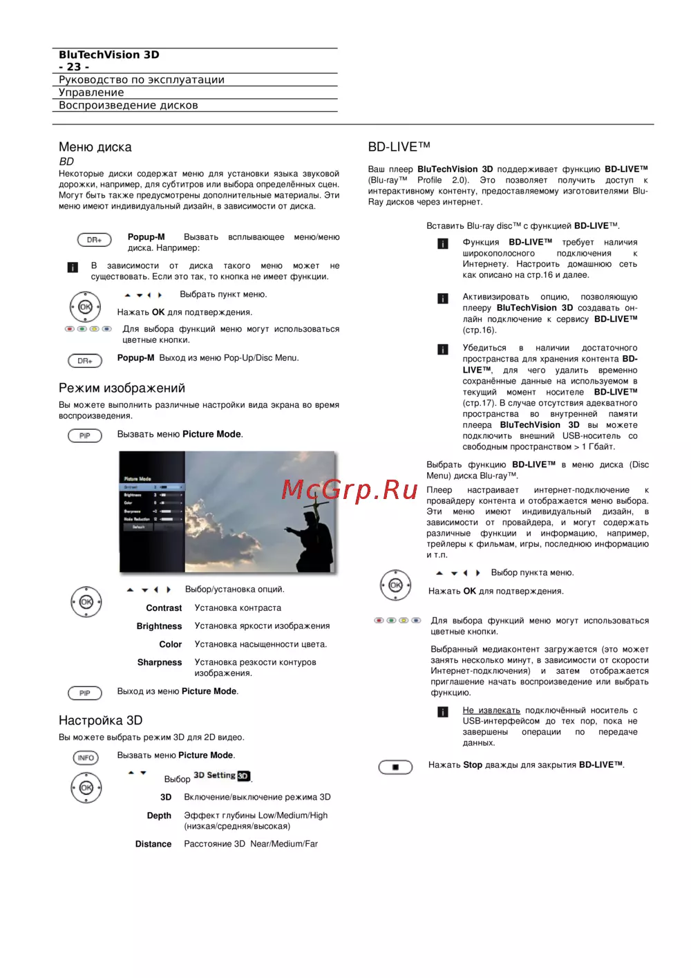 Изучите, как управлять воспроизведением дисков и настраивать режимы изображения на 3D плеере. Узнайте о функции BD-LIVE и настройках 3D для лучшего просмотра.