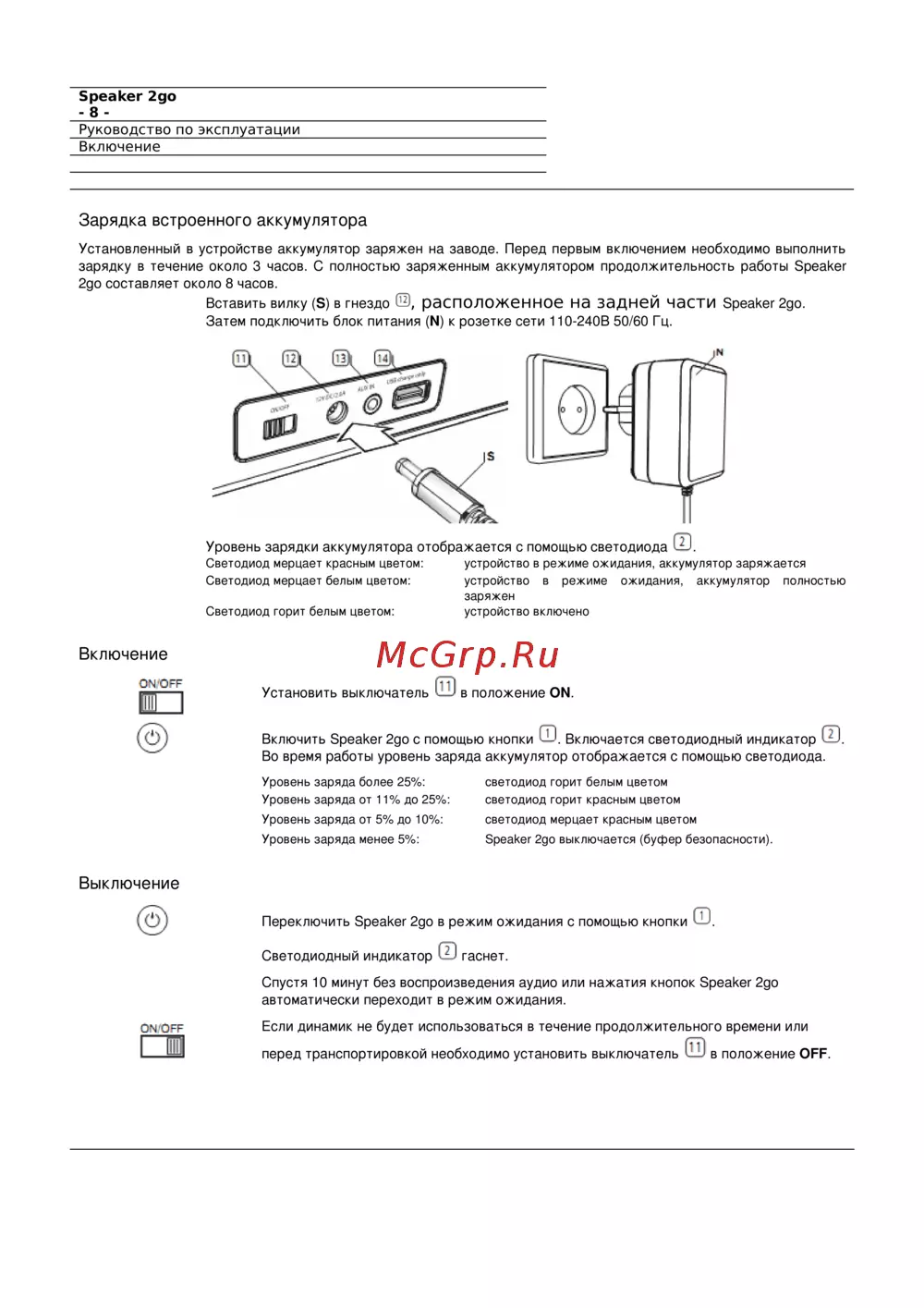 зарядку в течение около 3 часов. С полностью заряженным аккумулятором продолжительность работы Speaker