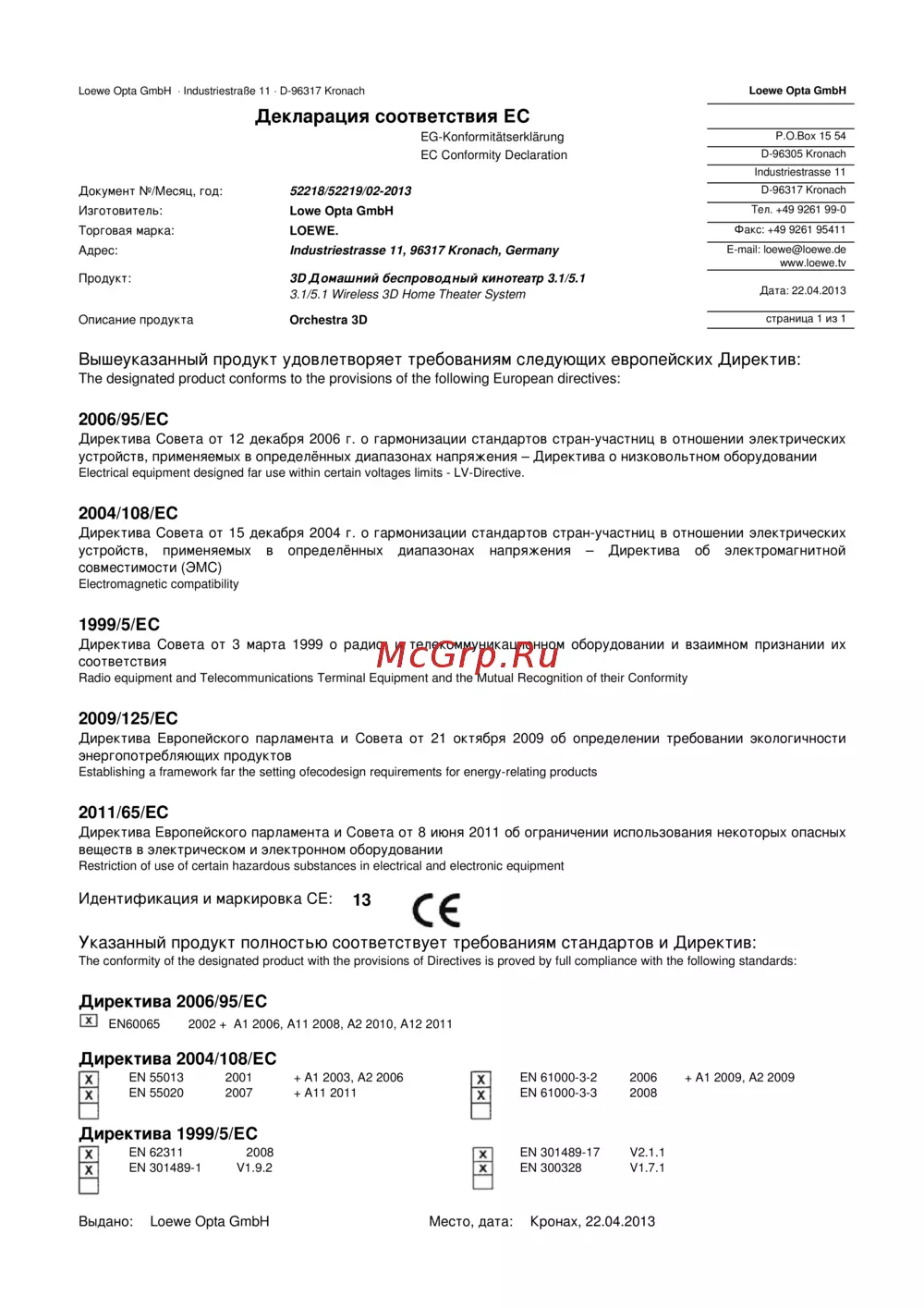 Выдано: Loewe Opta GmbH Место, дата: Кронах, 22.04.2013