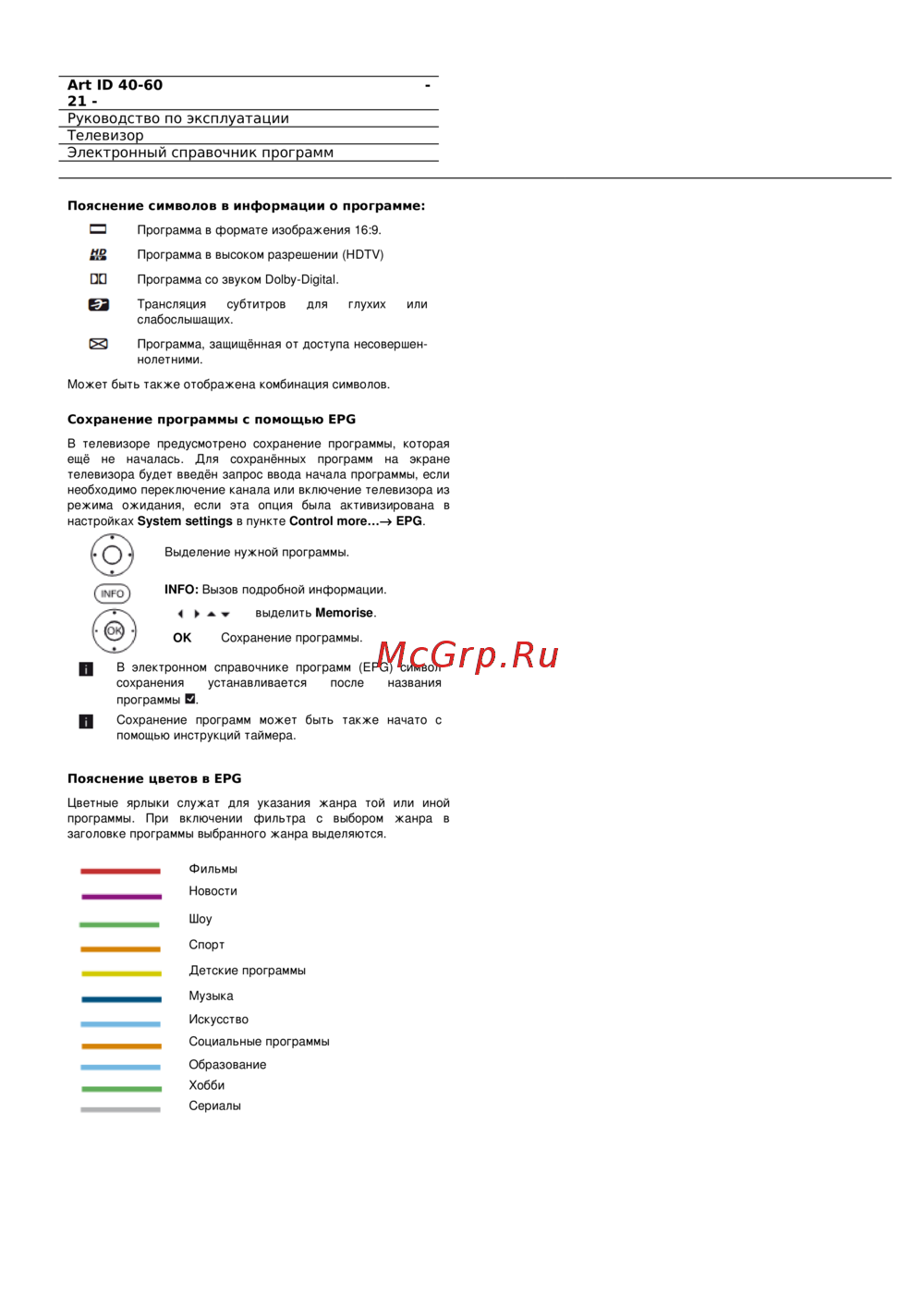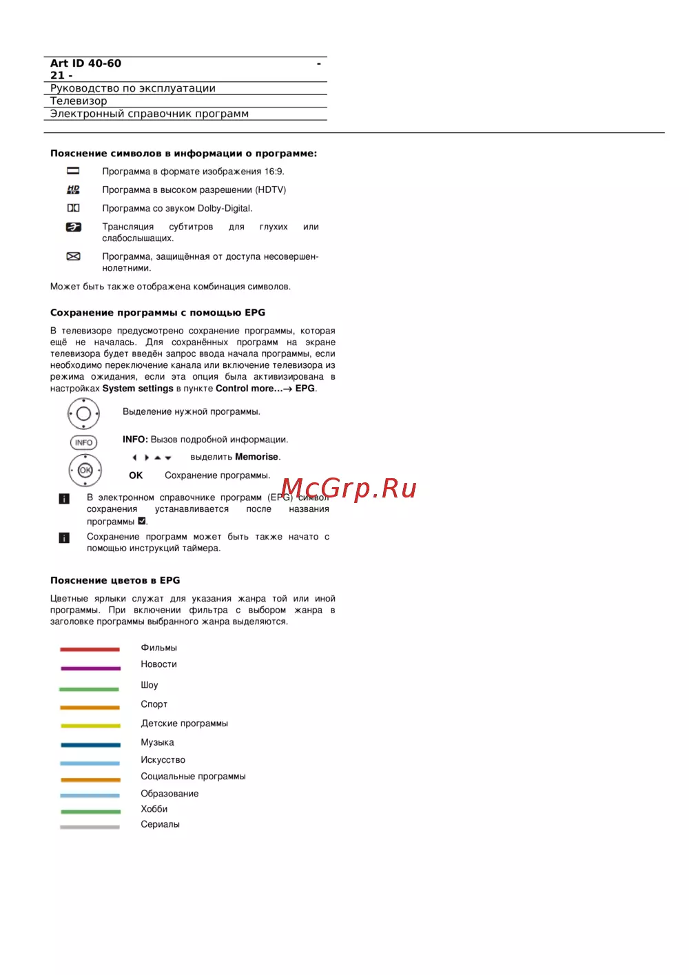 Узнайте, как использовать функции телевизора, включая сохранение программ и информацию о жанрах. Полезные советы для комфортного просмотра.