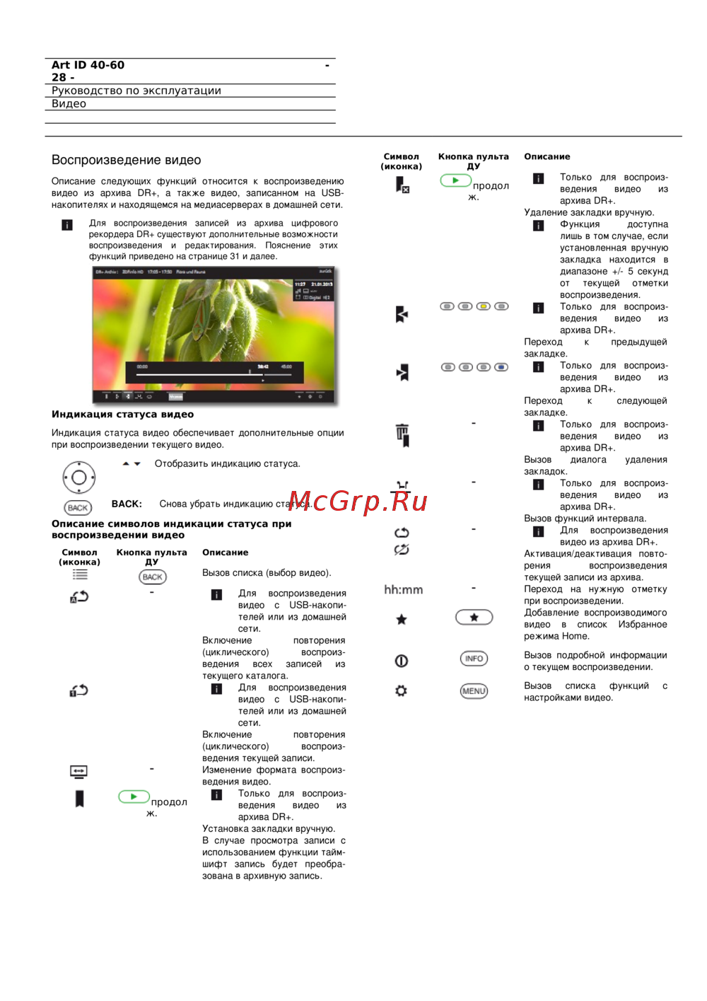 Узнайте о функциях воспроизведения видео из архива и USB-накопителей. Получите информацию о статусе видео, закладках и настройках воспроизведения.
