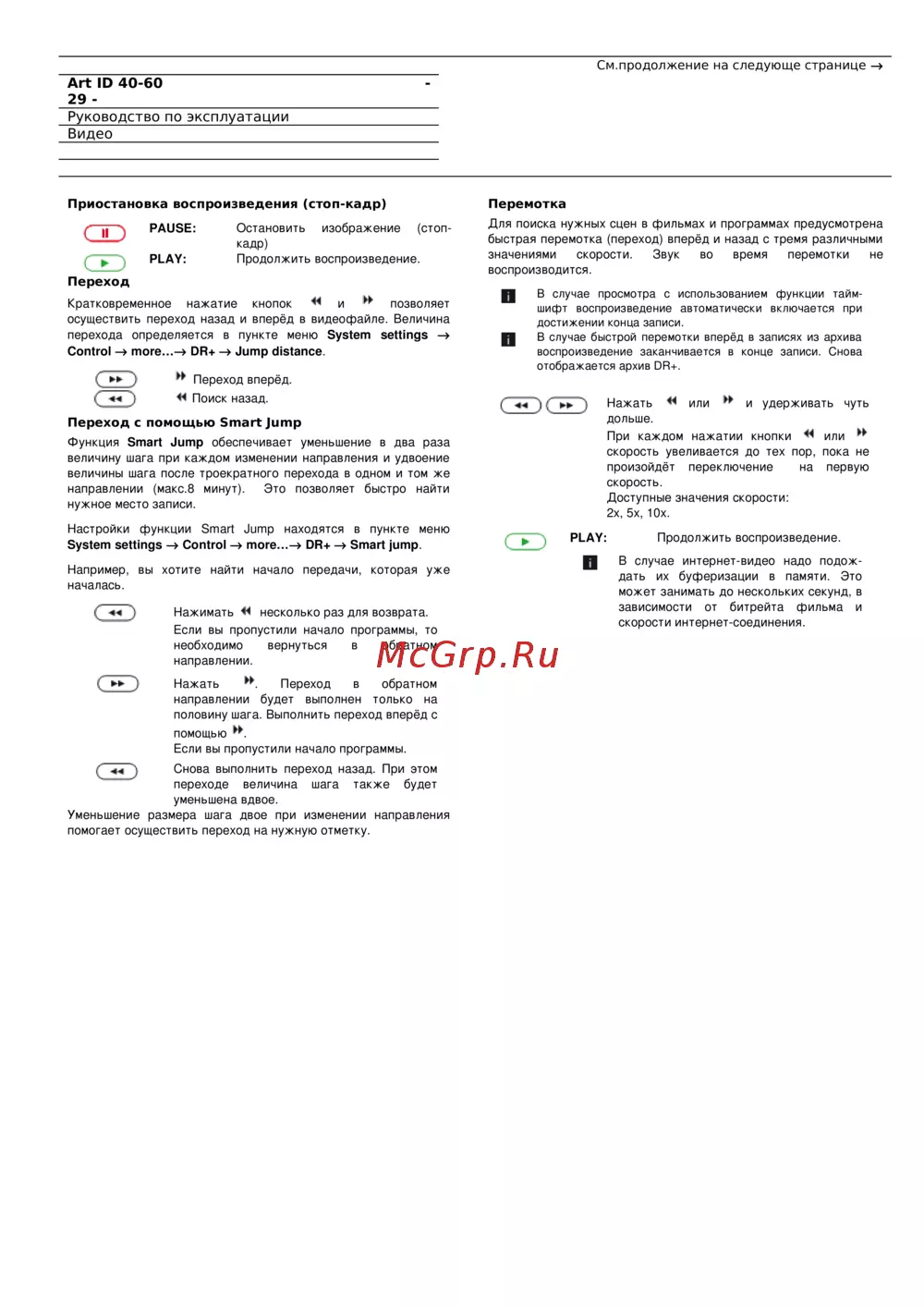 Узнайте, как управлять воспроизведением видео с помощью функций паузы, перемотки и Smart Jump. Настройте параметры для удобного просмотра и поиска нужных сцен.