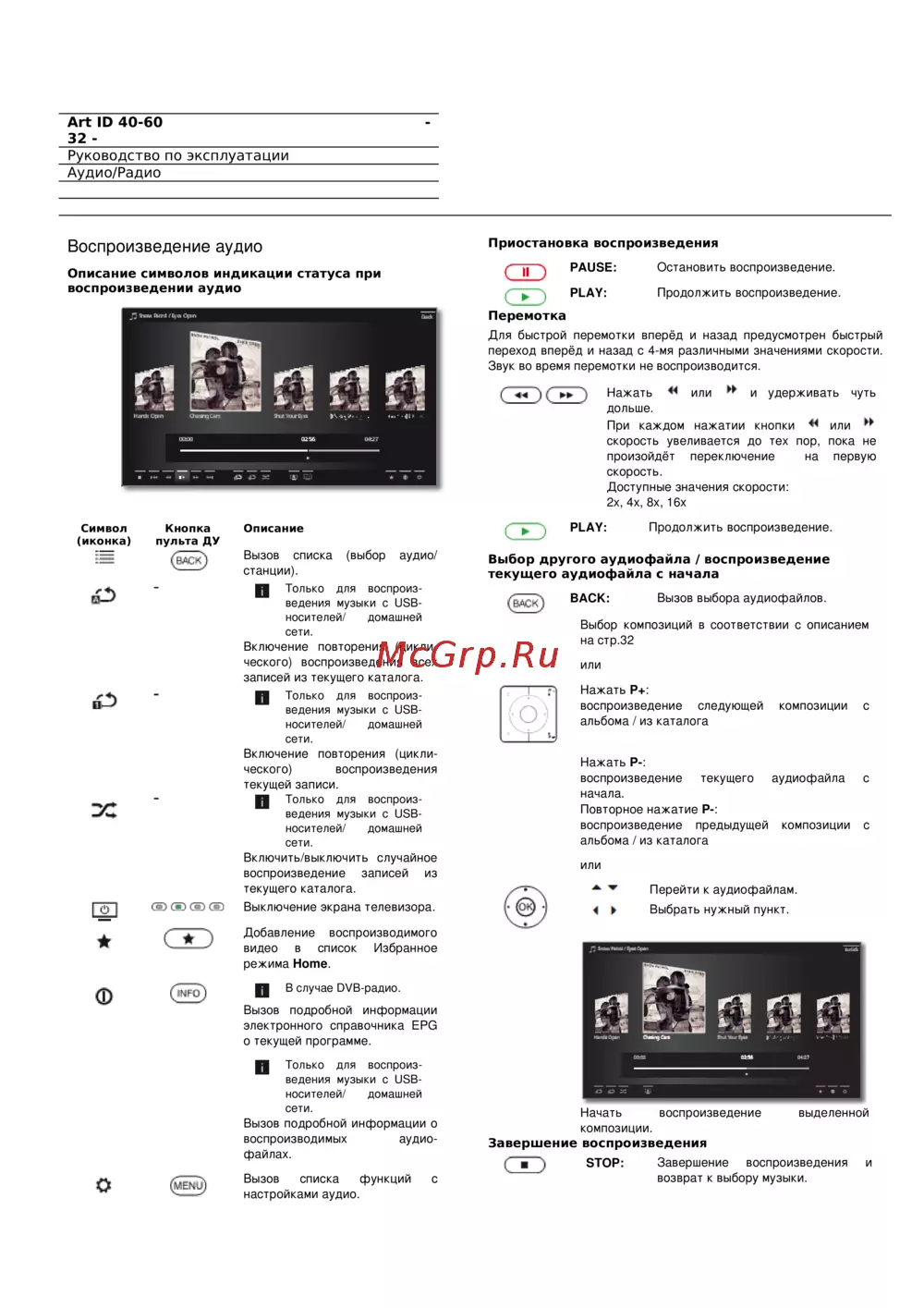 Изучите функции управления аудио и радио, включая воспроизведение, паузу, перемотку и выбор треков. Полное руководство для удобного использования.