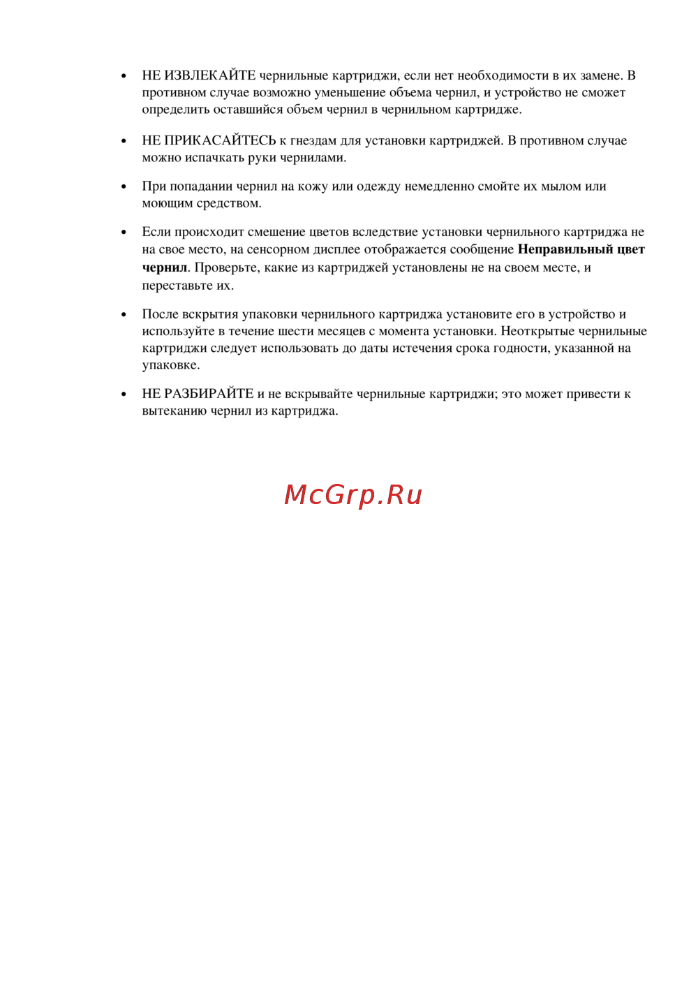 НЕ РАЗБИРАЙТЕ и не вскрывайте чернильные картриджи; это может привести к