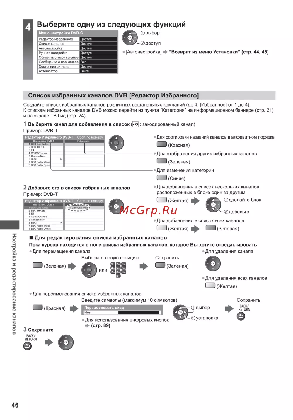 Создайте список избранных каналов различных вещательных компаний (до 4: [Избранное] от 1 до 4).