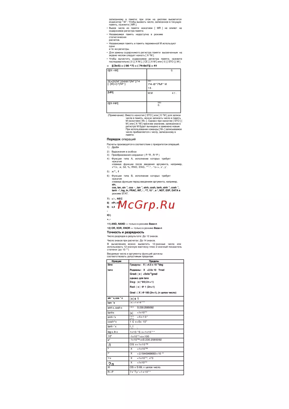 Инструкция по использованию памяти калькулятора: запись, вызов и очистка данных. Приоритет операций и точность вычислений. Ограничения функций.