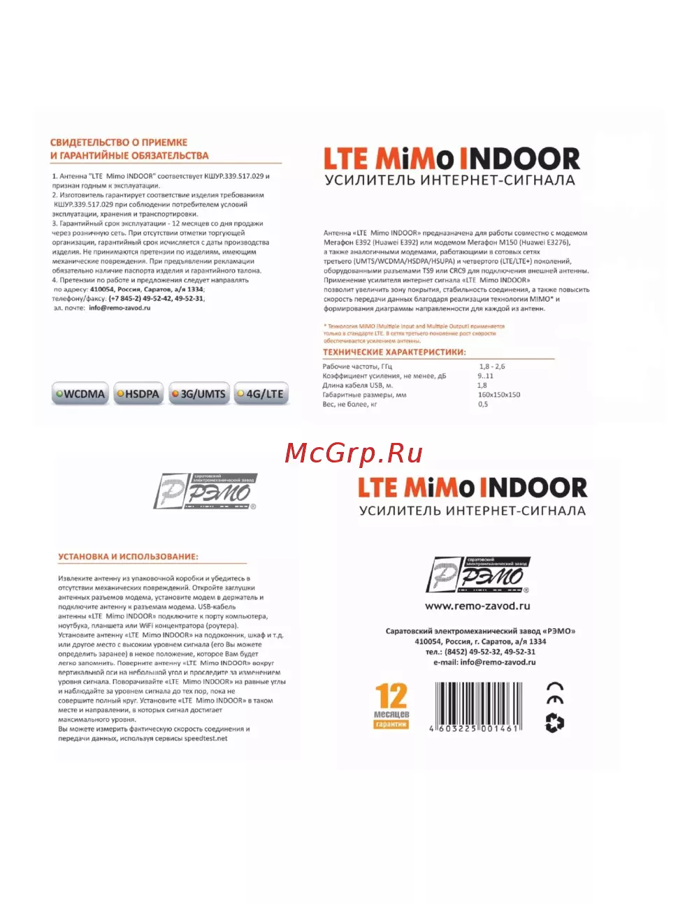 СВИДЕТЕЛЬСТВО О ПРИЕМКЕ И ГАРАНТИЙНЫЕ ОБЯЗАТЕЛЬСТВА 1 Антенна LTE Mimo INDOOR соответствует КШУР 339 517 029 и признан годным к эксплуатации 2 Изготовитель гарантирует соответствие изделия требованиям КШУР 339 517 029 при соблюдении потребителем условий эксплуатации хранения и транспортировки 3 Гарантийный срок эксплуатации 12 месяцев со дня продажи через розничную сеть При отсутствии отметки торгующей организации гарантийный срок исчисляется с даты производства изделия Не принимаются претензии пр изделиям имеющим механические повреждения При предъявлении рекламации обязательно наличие паспорта изделия и гарантийного талона 4 Претензии по работе и предложения следует направлять по адресу 410054 Россия Саратов а я 1334 телефону факсу 7 845 2 49 52 42 49 52 31 эл почте info remo zavod ru LTE MiMO INDOOR УСИЛИТЕЛЬ ИНТЕРНЕТ СИГНАЛА Антенна LTE Mimo INDOOR предназначена для работы совместно с модемом Мегафон Е392 Huawei Е392 или модемом Мегафон М150 Huawei Е3276 а также аналогичными модемами работающими в сотовых сетях третьего UMTS WCDMA HSDPA HSUPA и четвертого LTE LTE поколений оборудованными разъемами TS9 или CRC9 для подключения внешней антенны Применение усилителя интернет сигнала LTE Mimo INDOOR позволит увеличить зону покрытия стабильность соединения а также повысить скорость передачи данных благодаря реализации технологии MIMO и формирования диаграммы направленности для каждой из антенн Технология MiMO Multiple Input and Multiple Output применяется только 8 стандарте LTE В сетях третьего поколение рост скорости обеспечи ается усилением антенны ТЕХНИЧЕСКИЕ ХАРАКТЕРИСТИКИ О WCDMA HSDPA Q3G UMTS 4G LTE Рабочие частоты ГГц Коэффициент усиления не менее дБ Длина кабеля USB м Габаритные размеры мм Вес не более кг 1 8 2 6 9 11 1 8 160x150x150 0 5 LTE MiMO INDOOR УСИЛИТЕЛЬ ИНТЕРНЕТ СИГНАЛА УСТАНОВКА И ИСПОЛЬЗОВАНИЕ Извлеките антенну из упаковочной коробки и убедитесь в отсутствии механических повреждений Откройте заглушки антенных разъемов модема установите модем в держатель и подключите антенну к разъемам модема USB кабель антенны LTE Mimo INDOOR подключите к порту компьютера ноутбука планшета или WiFi концентратора роутера Установите антенну LTE Mimo INDOOR на подоконник шкаф и т д или другое место с высоким уровнем сигнала его Вы можете определить заранее в некое положение которое Вам будет легко запомнить Поверните антенну LTE Mimo INDOOR вокруг вертикальной оси на небольшой утл и прослрдитр за изменением уровня сигнала Поворачивайте LTE Mimo INDÜOR на равные углы и наблюдайте за уровнем сигнала до тех пор пока не совершите полный круг Установите LTE Mimo INDOOR в таком месте и направлении в которых сигнал достигает максимального уровня Вы можете измерить фактическую скорость соединения и передачи данных используя сервисы speedtest net www remo zavod ru Саратовский электромеханический завод РЭМО 410054 Россия г Саратов а я 1334 тел 8452 49 52 32 49 52 31 e mail info remo zavod ru 12 II II месяцев 4 605225 001461