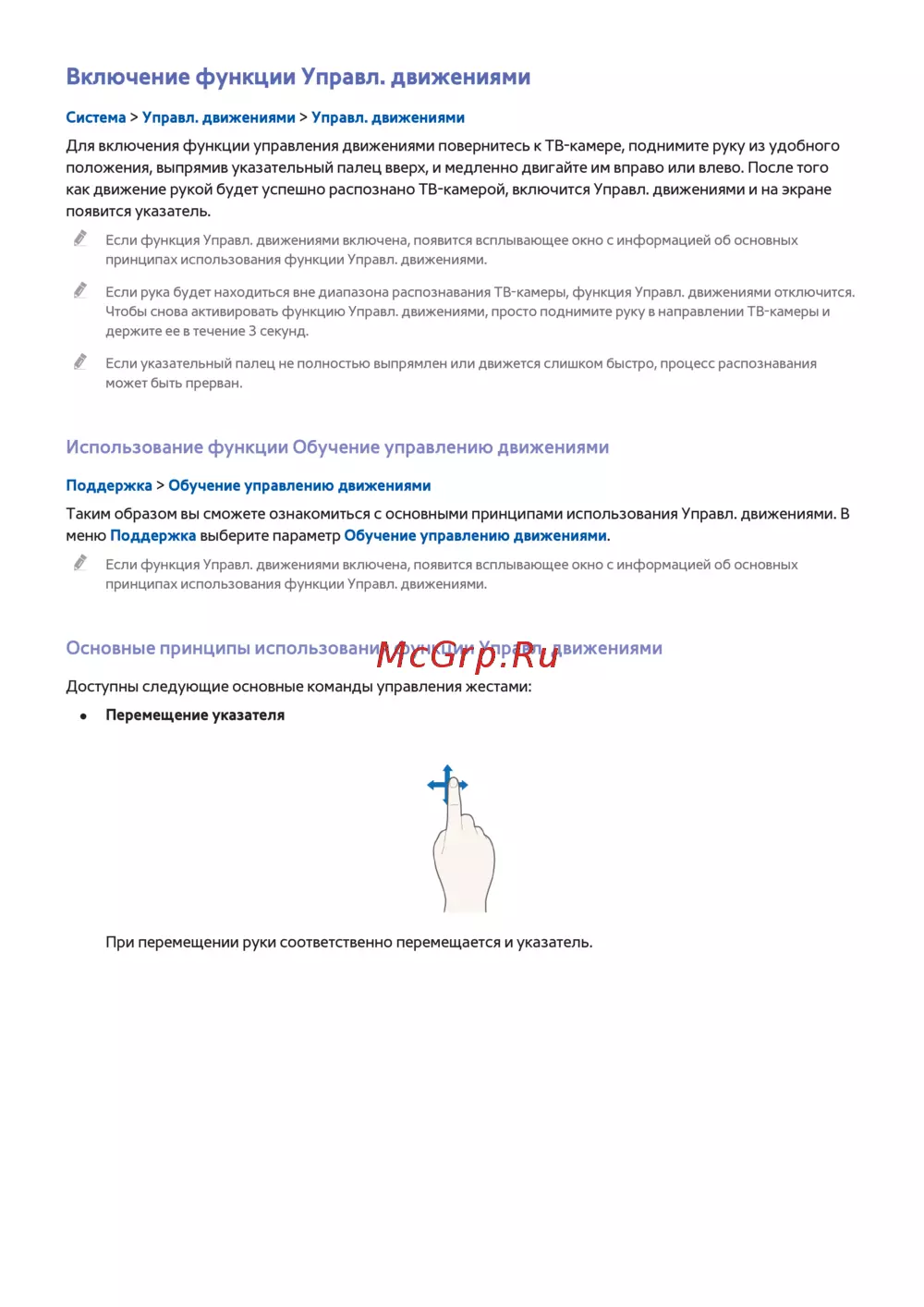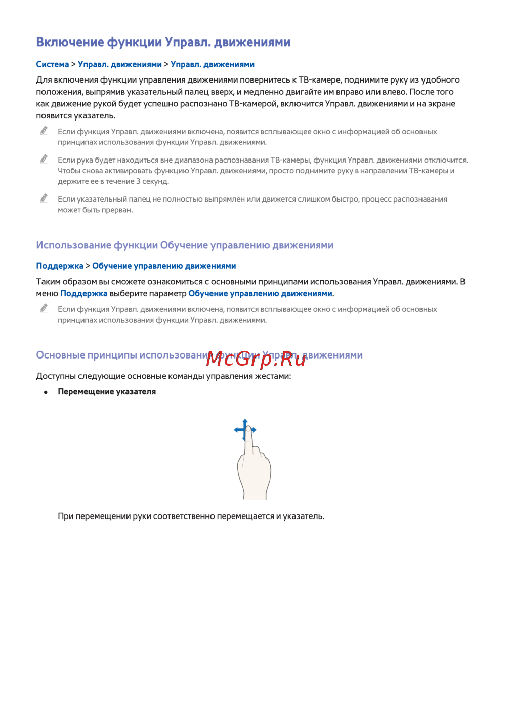 Если рука будет находиться вне диапазона распознавания ТВ-камеры, функция Управл. движениями отключится.