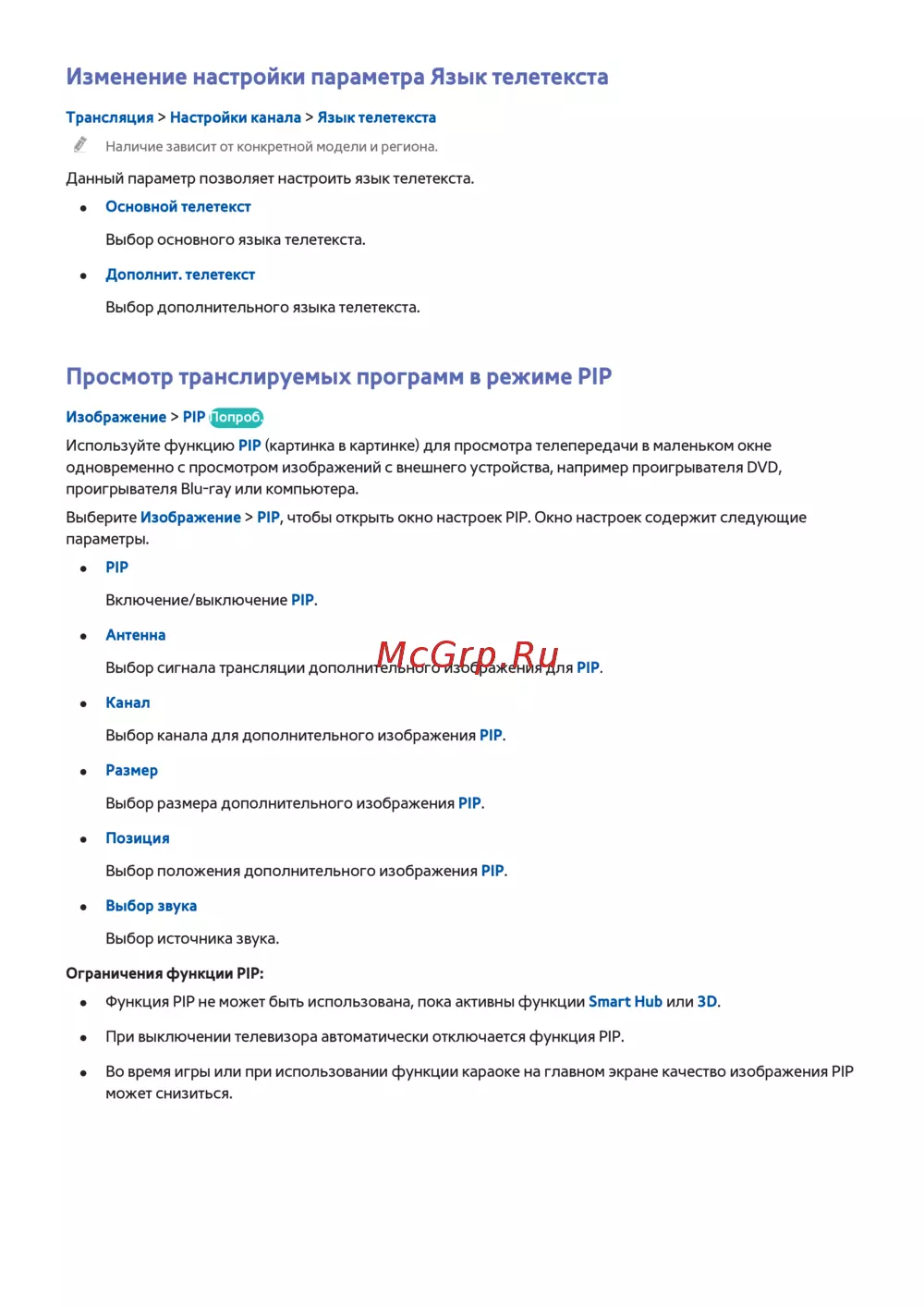 Функция PIP не может быть использована, пока активны функции Smart Hub или 3D.