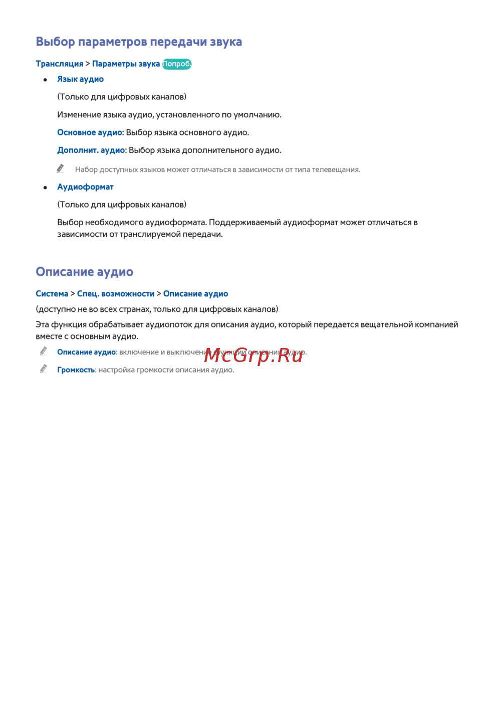 Описание аудио: включение и выключение функции описания аудио.