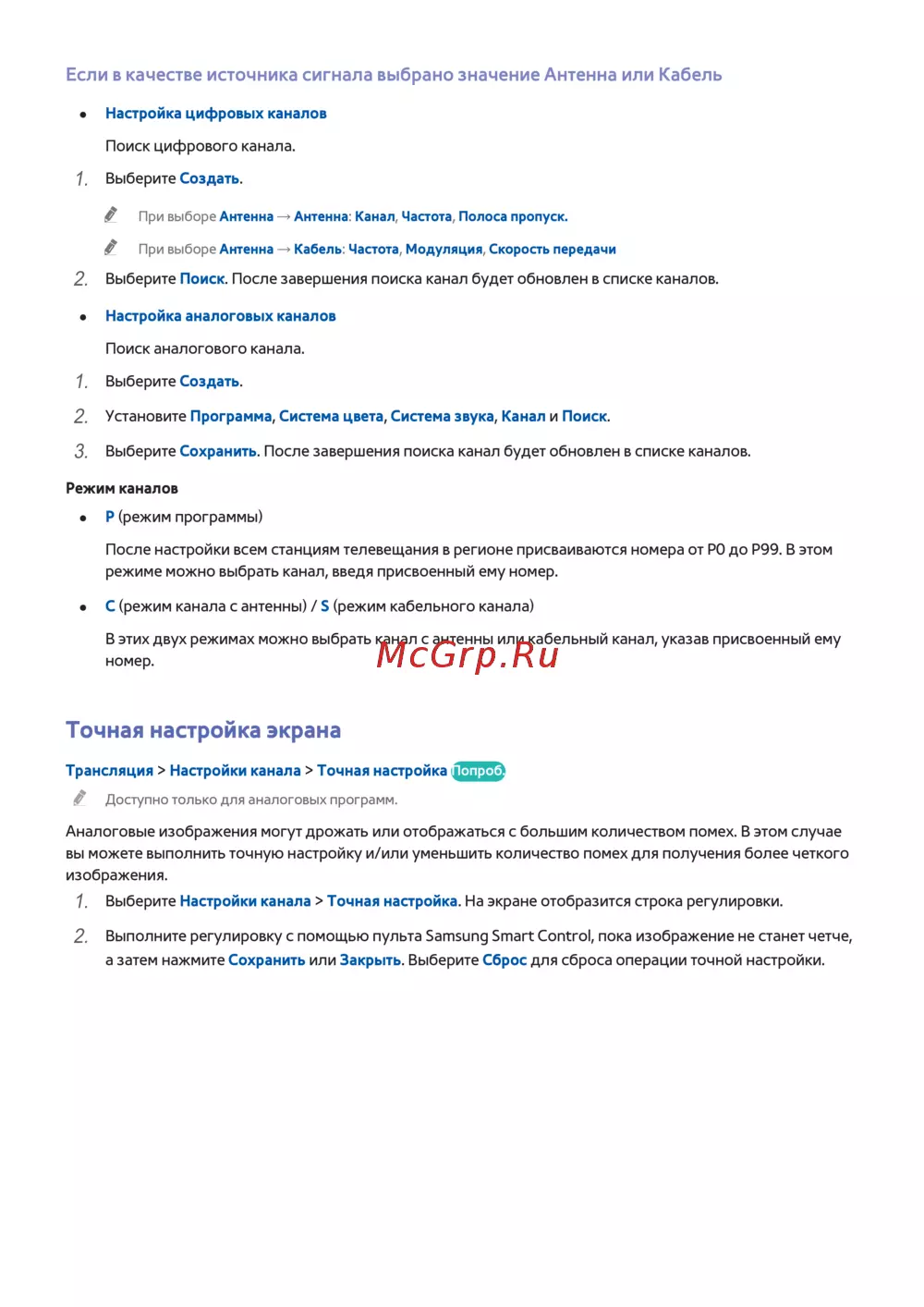 В этих двух режимах можно выбрать канал с антенны или кабельный канал, указав присвоенный ему