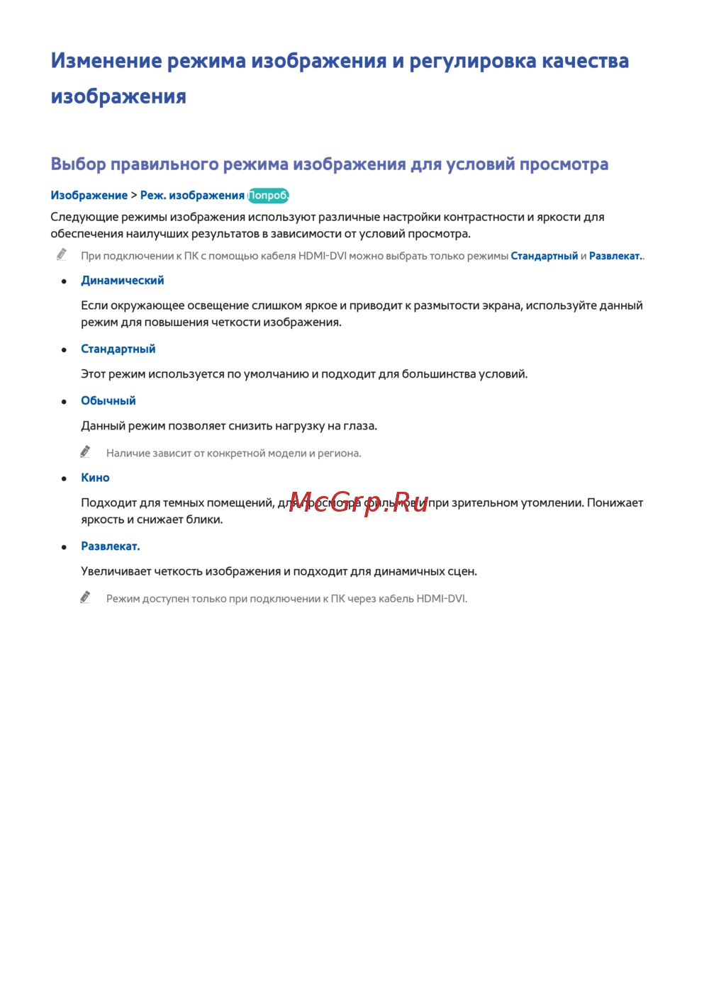 При подключении к ПК с помощью кабеля HDMI-DVI можно выбрать только режимы Стандартный и Развлекат..
