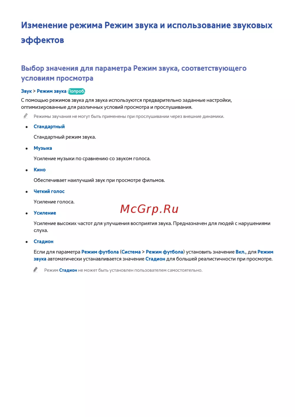 С помощью режимов звука для звука используются предварительно заданные настройки,