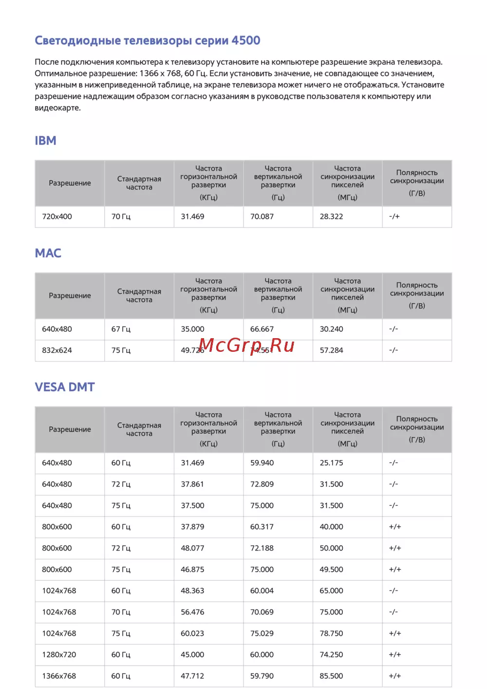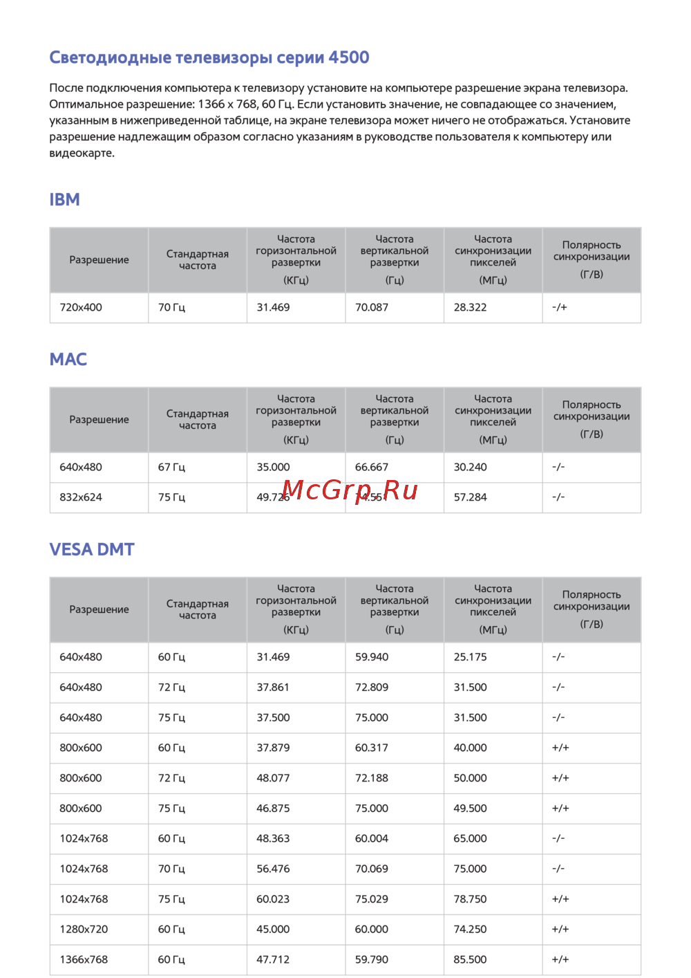 - При подключении телевизора к компьютеру установите стандартное разрешение видеокарты перечисленное в таблицах ниже или на следующей странице на телевизоре будет автоматически выполнена настройка выбранного разрешения примите во внимание что оптимальным и рекомендуемым является разрешение 1920 x1080 p.223